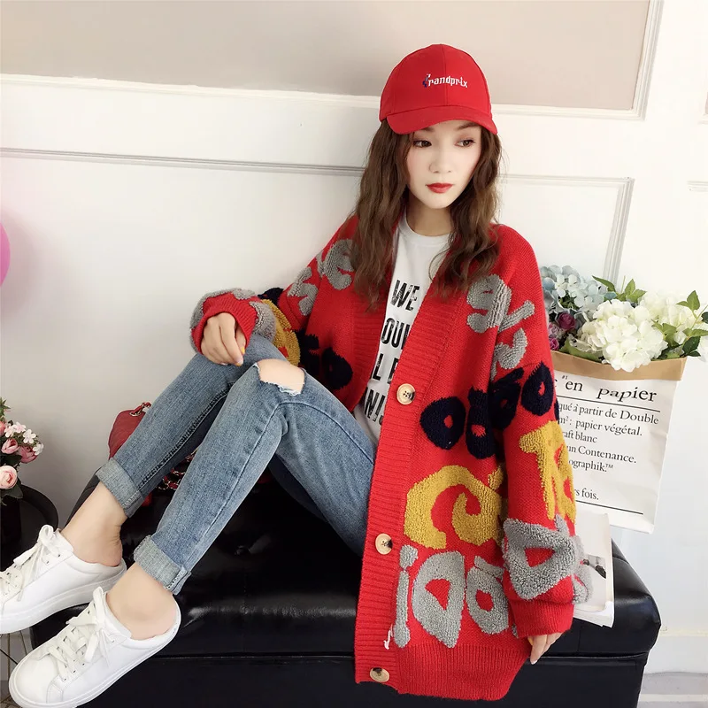 Кардиган женский вязаный, красный, свободный, с вышитыми буквами, Осень-зима, 2021