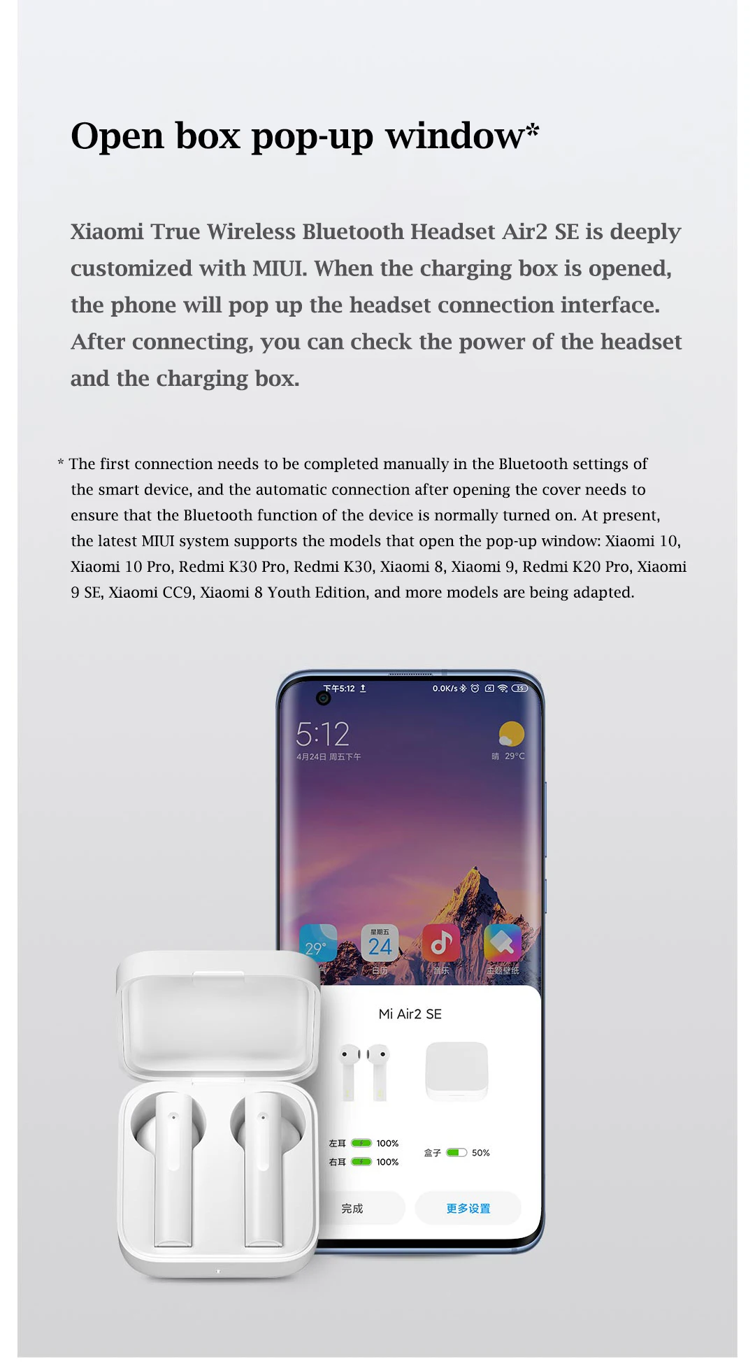Беспроводная bluetooth-гарнитура Xiaomi True Air 2sМодель продукта: TWSEJ05WMСрок службы одной батареи гарнитуры: около 5 чВес нетто продукта: 52 гС общим сроком службы аккумулятора зарядного устройства: около 24 чБеспроводное подключение: Bluetooth 5,0Рабочее расстояние: 10 м (открытая и безбарьерная среда)Сопротивление динамика: 32QПоддержка кодека: LHDC/SBC/AACПорт зарядки: Type-CПротокол Bluetooth: BL. E/HSP/HFP/A2DP/AVRCPВход параметры: 5V-= 1AИсполнительный стандарт: Q/WMSX 002-201 6Время зарядки: 1 ч (с помощью проводной зарядки)
