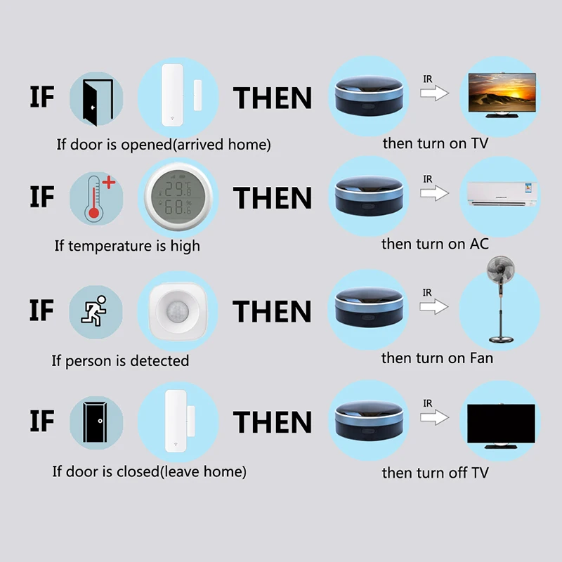 Создавая «автоматизацию» в приложении и взаимодействуя с другими устройствами Tuya smart home, универсальный пульт дистанционного управления может выполнять действия автоматически в соответствии с такими условиями, как состояние устройства, погода и время. Обратите внимание: дверной датчик, датчик температуры и датчик движения не включены в посылка.
