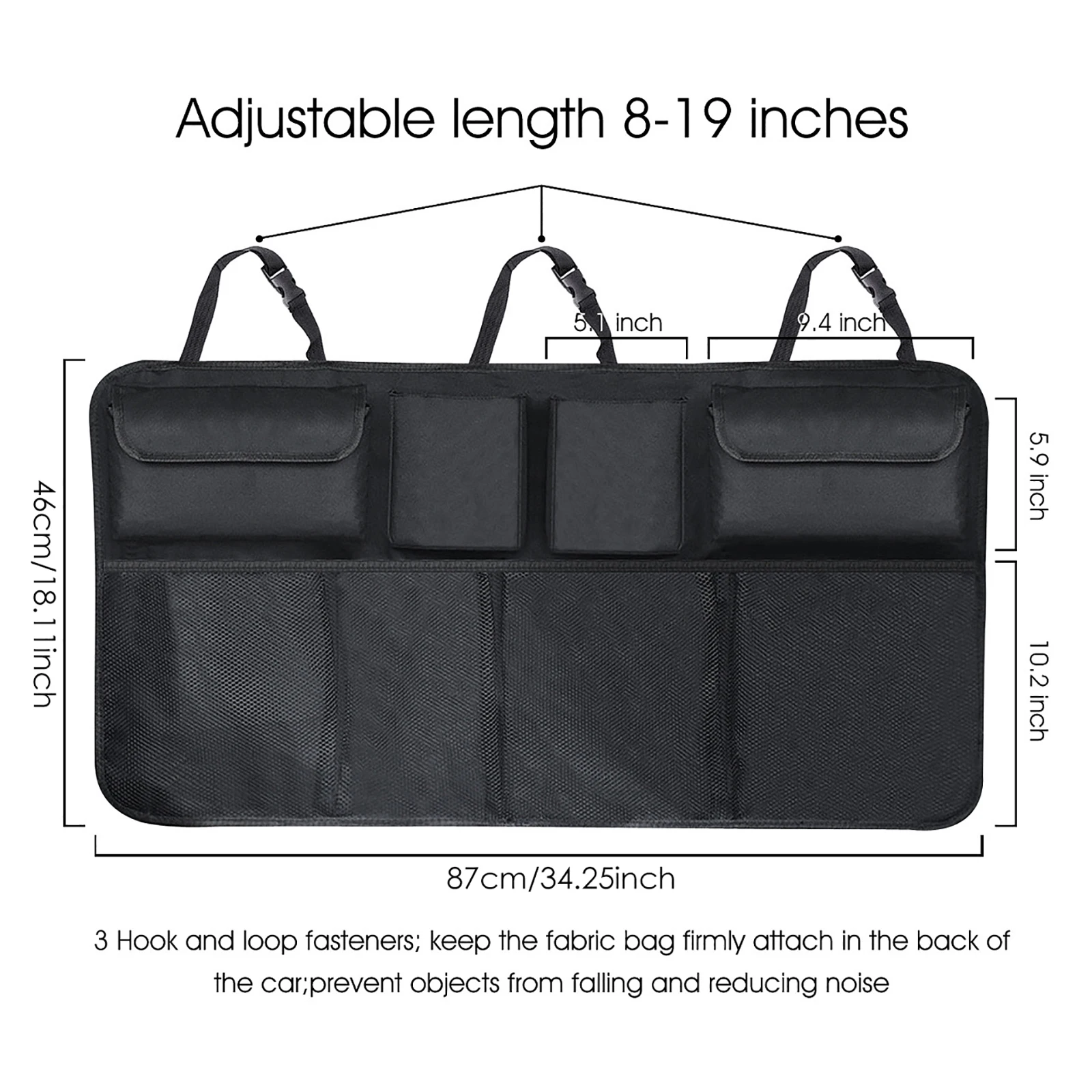 Подвесной органайзер для багажника автомобиля и сумка для хранения, складной висячий мешок большой вместимости, легко устанавливается и моется, компактный органайзер для багажника джипов, внедорожников, фургонов, сетчатых кармановХарактеристика:Высококачественный материал: наш органайзер для багажника автомобиля изготовлен из высококачественной ткани Оксфорд с 4 карманами, 4 легких нейлоновых сетчатых кармана и 3 пряжками. Прочный, водонепроницаемый и устойчивый к царапинам, обеспечивая его долговечность.Подходящий Размер: 34,25 дюйма в длину и 18,11 дюйма в ширину. Подходит для большинства автомобилей, внедорожников, грузовиков и 90% автомобилей. Необходимо иметь для взрослых поездок по дорогам, очень полезно и удобно для поездок по дорогам. Наша складная сумка для хранения не занимает много места для хранения.Держите его в порядке: ваш багажник грязный? Это определенно поможет. Есть 4 глубоких кармана и сетчатые карманы для дополнительного места для хранения. Вы можете положить инструменты, игрушки, закуски, книги и другие предметы вместе и организовать. Когда вы спешите, вы также можете легко найти все, что вам нужно. Обеспечьте чистый багажник.Легко установить и очистить: быстро установить и удалить в течение нескольких секунд, использовать регулируемый плечевой ремень, крючок на подголовник, и сделать. Можно стирать и чистить влажной тканью.Для консультации по продукту, пожалуйста, свяжитесь с нами. Мы к вашим услугам в любое время.Спецификация:Название продукта: Автомобильная складная сумка для хранения багажникаЦвет: черныйМатериал: ткань ОксфордРазмер изделия: общая длина x Общая ширина: 87x4 6 см/34.25x18.11 дюймовУпаковка: OPPВес: 470 гПримечание:Вследствие различных особенностей цветопередачи на разных мониторов и светильник эффект, фактический цвет элемента может быть s светильник ly отличается от цвета, представленного на снимках. Спасибо!Возможны отклонения в 1-2 см вследствие измерений вручную.