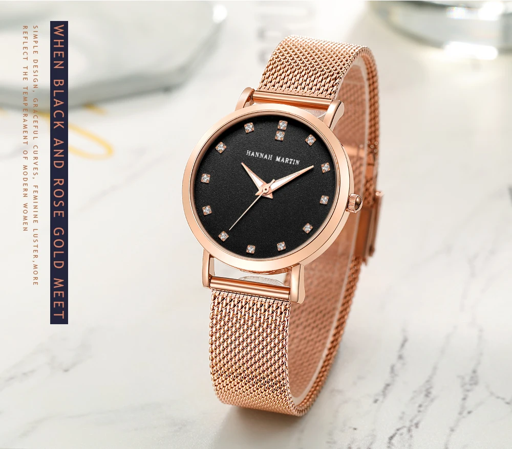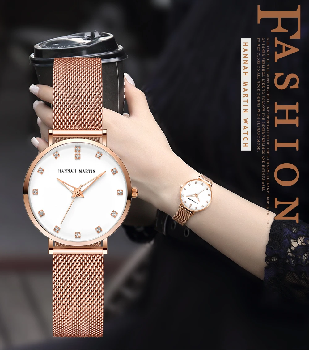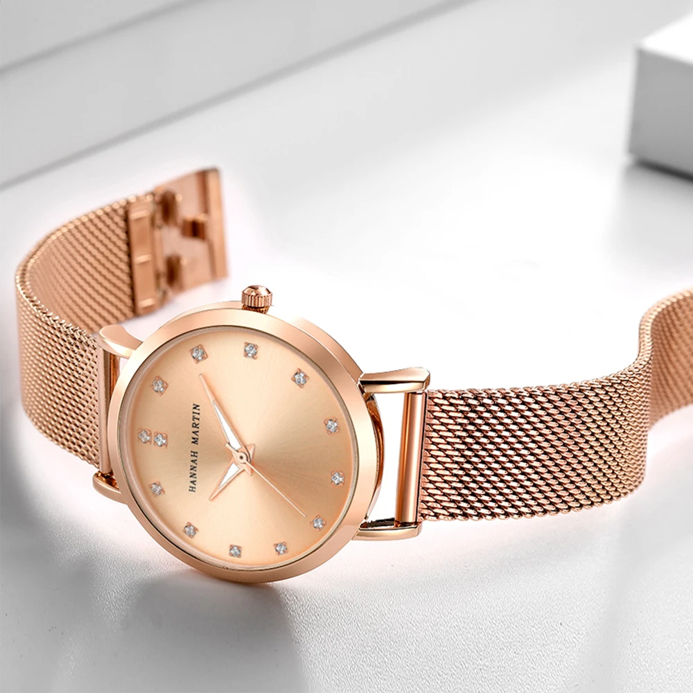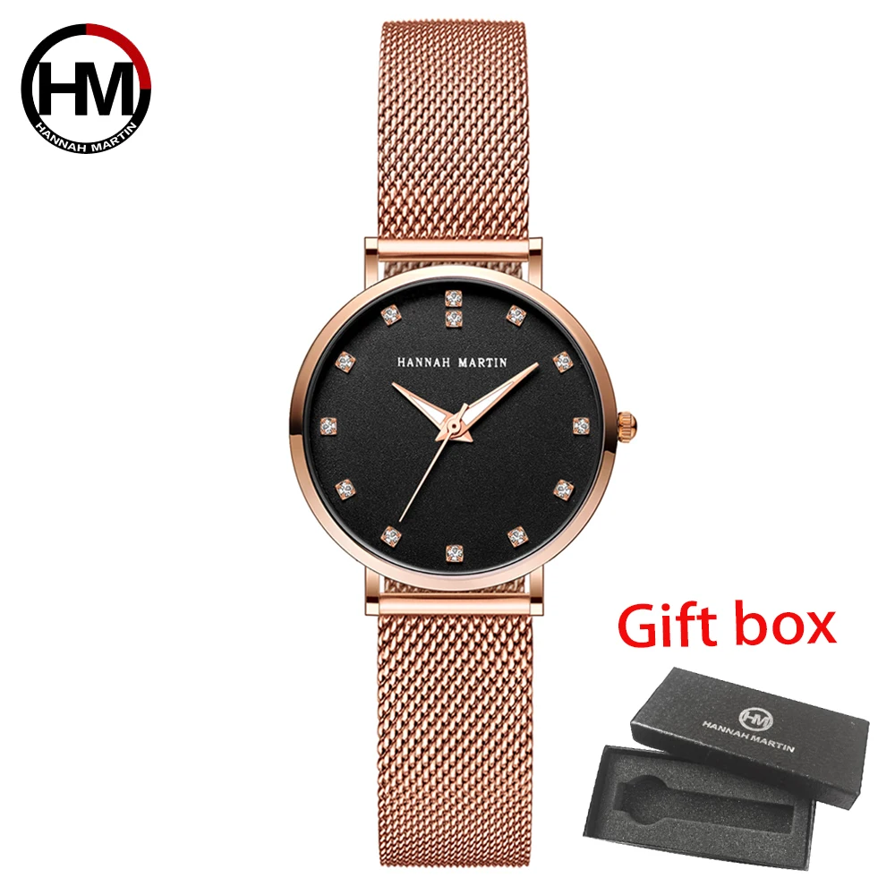 Женские кварцевые часы Hannah Martin, японские часы MIYOTA 2035 с сетчатым браслетом из нержавеющей стали, водонепроницаемые часы цвета розового золота для женщин