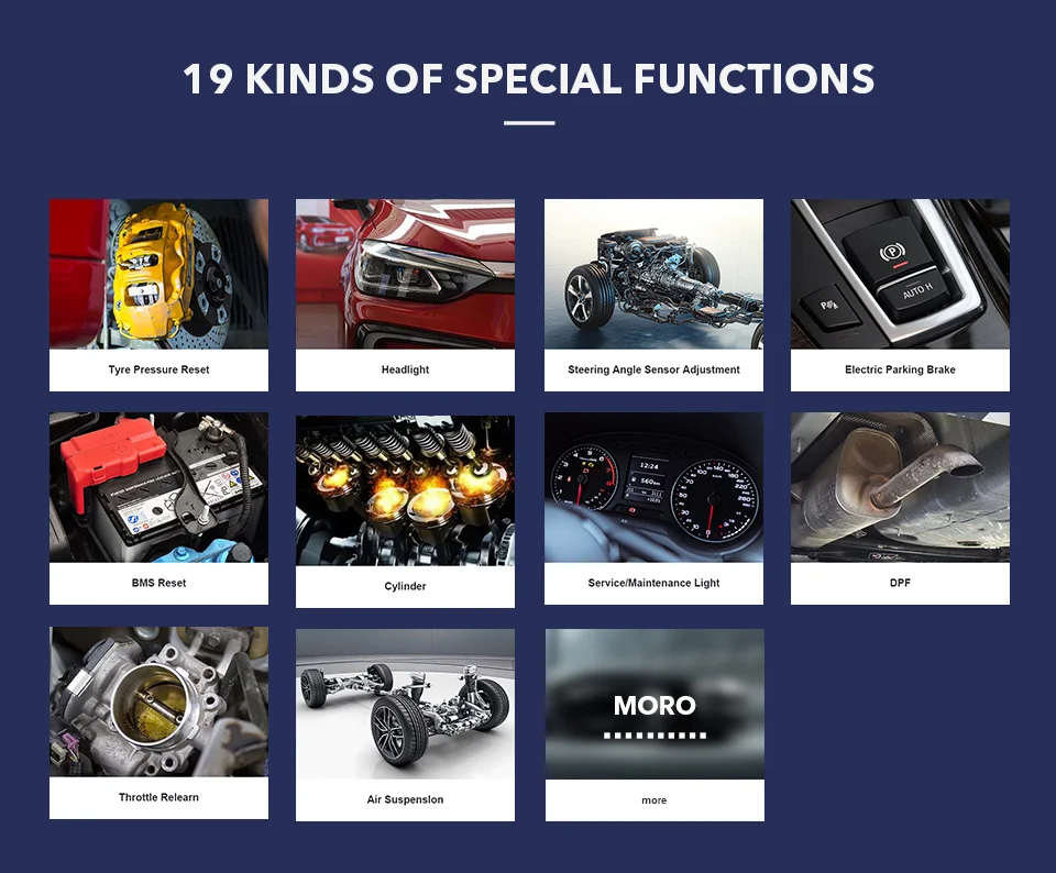 * Масло/обслуживание/ремонтный светильникВыполняет сброс для системы эксплуатации моторного масла, которая вычисляет оптимальный интервал изменения срока службы масла в зависимости от условий вождения автомобиля и климата, и выключает предупреждающий светильник* SASВыполняет калибровку датчика угла поворота руля (SAS), который постоянно хранит текущее положение руля как положение прямого вперед в датчике угла руля EEPROM. При успешном завершении калибровки автоматически очищается память датчика угла поворота руля* EPBНадежно и эффективно поддерживает электронную тормозную систему путем деактивации и активации системы управления тормозом, помощи в управлении тормозной жидкостью, открывании и закрывании тормозных колодок и установке тормозов после замены диска или колодки и т. д.* DPFВыполняет множество функций для дизельной системы фильтров твердых частиц. Инструмент будет управлять регенерацией DPF, заменой компонентов DPF после замены блока управления двигателем* ФараОн обнаруживает светильник окружающей среды, затем решает, автоматически ли включать головной светильник s или нет. Он также может регулировать фары во времени* Сброс BMSПовторное соответствие модулю управления и датчику моторизования для более точного обнаружения батареи, четкая оригинальная информация о низком заряде батареи и предотвращение обнаружения ложной информации о соответствующем модуле управления* Сброс давления в шинахПовторно изучите датчики TPMS, чтобы новые датчики могли быть признаны ECU* ABS кровотечение, воздушная подушка, Ремонтный комплект, коленчатый вал Resync, Кодирование инжектора, коробка передач, и многое другое... ..