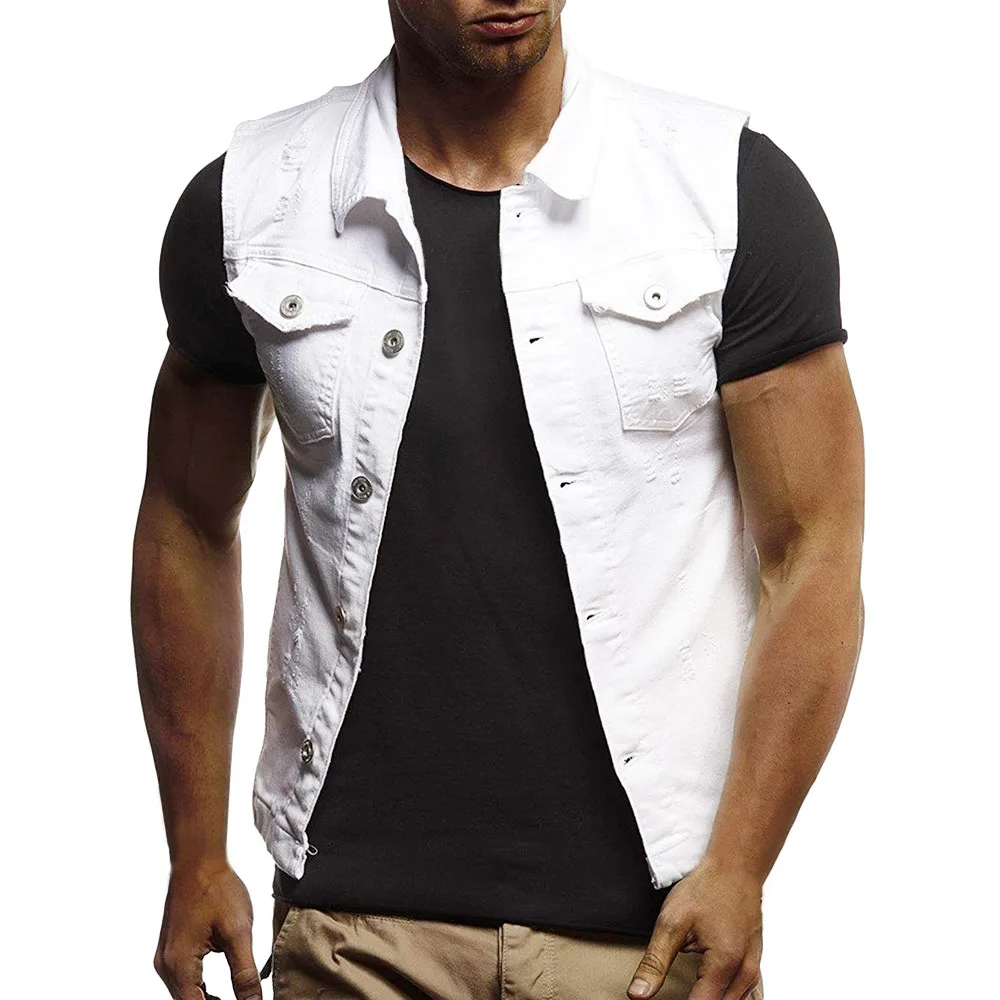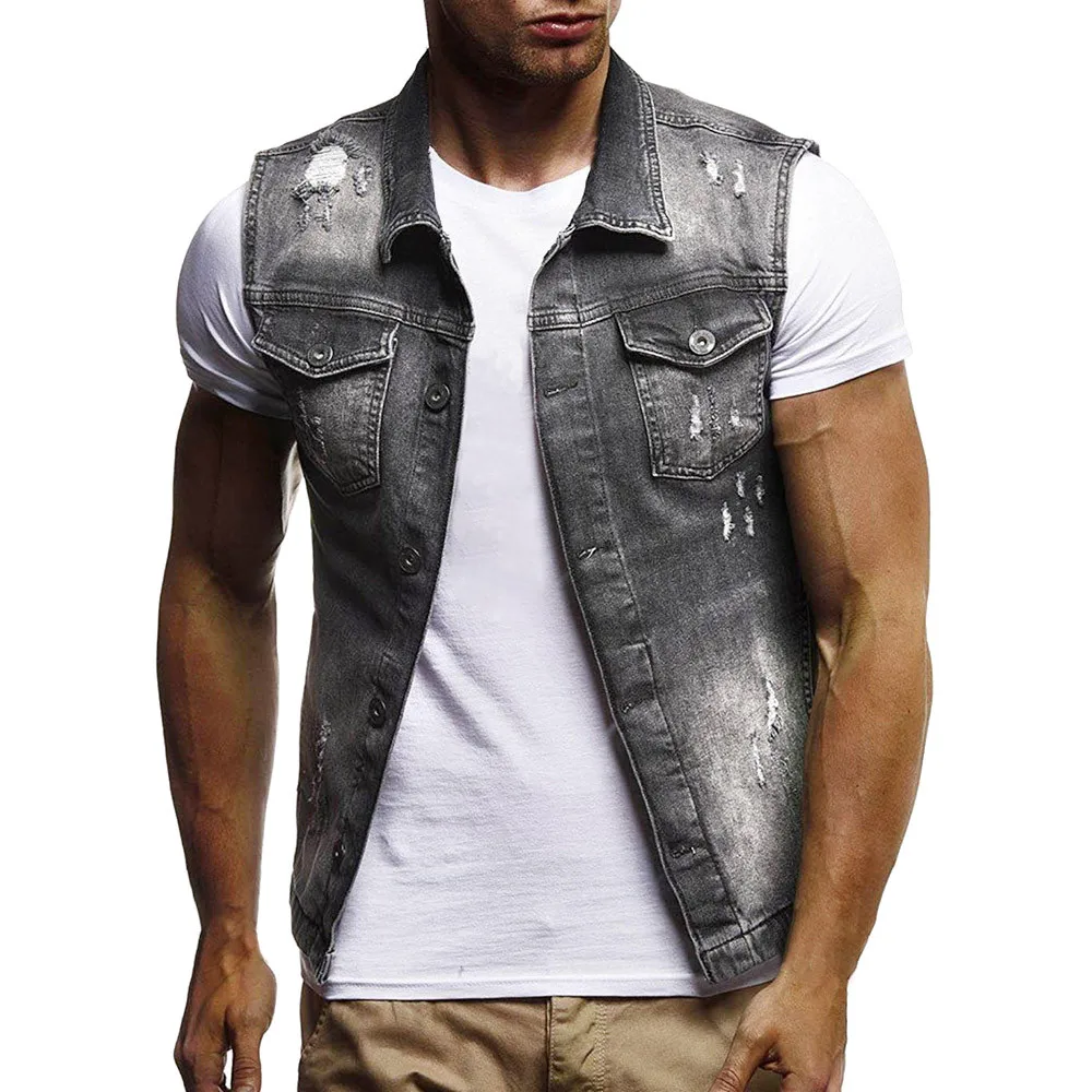 Мужской Состаренный эластичный жилет на пуговицах, джинсовый жилет без рукавов, повседневный уличный топ для бега