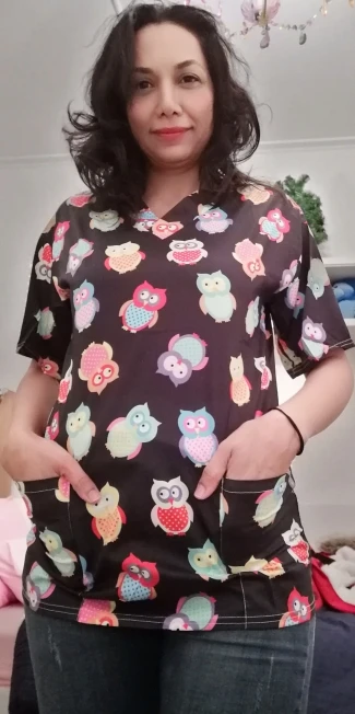 2: Топ унисекс с v-образным вырезом, передний нагрудный карман с прорезью для карандаша и боковыми разрезами.