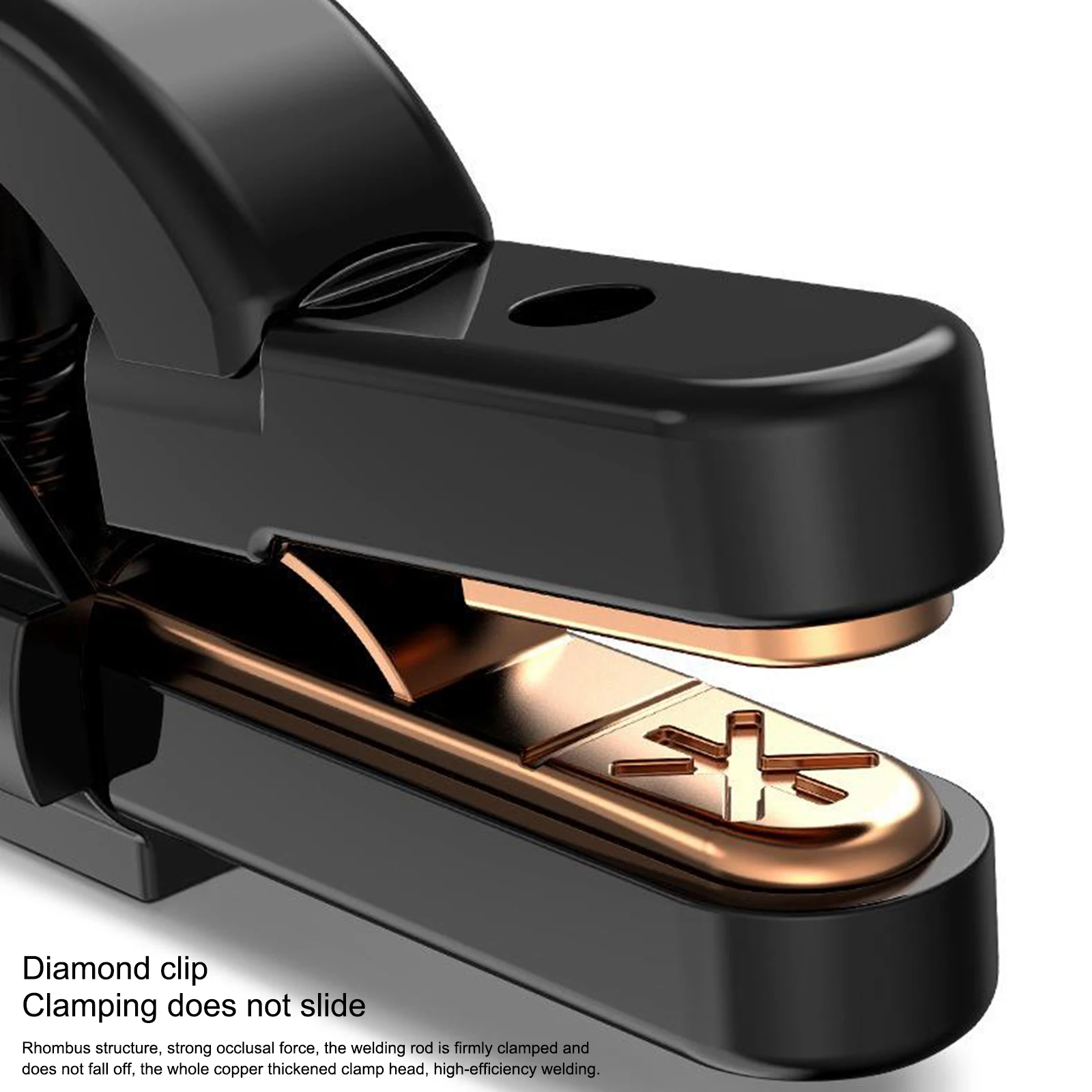 -Ромбовидные зажимные челюсти не скользят. Ромбовидная структура имеет сильную силу укуса, а сварочный стержень прочно зажимается и не отпадает. Полностью медная утолщенная Зажимная головка является высокоэффективной сваркой.