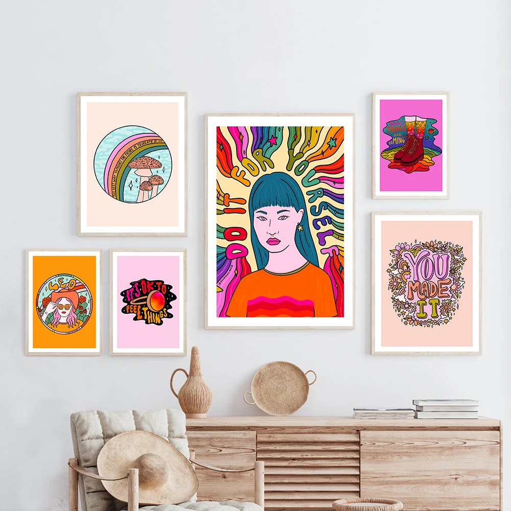 Мультяшный феминистский знак мира постер с радугой, настенный худож...