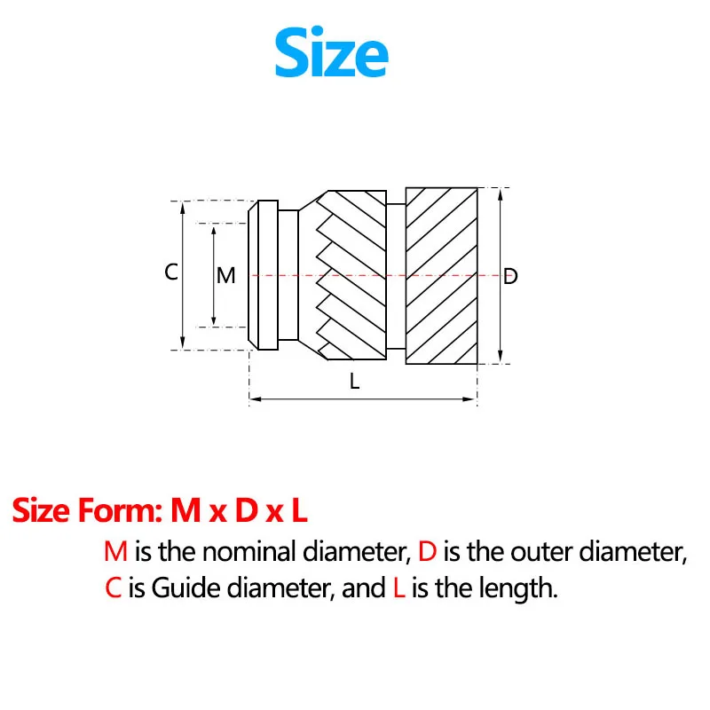 (M-номинальный диаметр, D-внешний диаметр, C-диаметр направляющей, L-длина.)