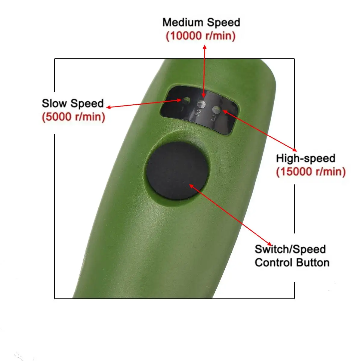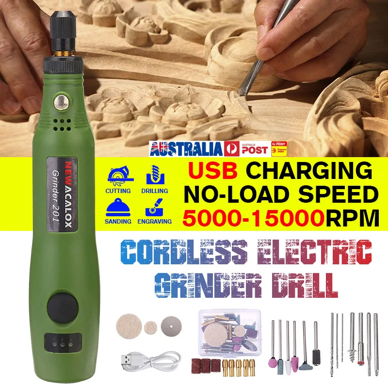 Описание:Материал: АБС-пластикЦвет: зеленыйЦанговый патрон диаметр: 0,5-3,2 ммНоминальная потребляемая мощность: 10 ВтСкорость без нагрузки: 5000-15000 об/минВремя холостого хода: 2 часаВремя работы полировки: до 1 часаВыходное напряжение: 3,7 V / 10AВходное напряжение: 5 В постоянного тока USBВес посылка: прибл. 183 гХарактеристика:1. Прочный и надежный-небольшого объема, светильник вес, легко взять с собой, одноразовая бритва с удобной ручкой, лучше контролировать предлагает при бурении., удобно в использовании.2. Скорость регулирования-этот Электрический инструмент для резьбы имеет 3 регулировки скорости, диапазон регулировки скорости: 5000 15000 об/мин.3. Полные аксессуары-оснащены 25 шт. аксессуарами для бурения, все готово и завершено.4. Идеальная шлифовальная машина-идеальная электрическая шлифовальная машина для резки, гравировки, фрезерования, шлифования, полировки, удаления и сверления. Набор гравировки шлифовальной машины необходим для самостоятельной резьбы и шлифования.5. Подходит для Нефритового агата, ядерной резьбы, резьбы по дереву, шлифовки алюминиевой пластины, тонкой медной доски, пластиковой доски, ДСП, печатной платы, эпоксидной доскиПосылка включает в себя:1 шт. USB электрическая дрель1 шт. USB провод (5 В постоянного тока)1 шт. Зажим оправки1 шт. резиновое колесо1 шт. нарезной стержень1 шт. дисковая пила2 шт. алмазная шлифовальная иглаПолировальное колесо из шерсти, 2 шт.3 шт круг наждачной бумаги3 шт. сверла5 шт. Шлифовальная головка6 шт. электрические сверла Цанга (0,5 мм, 1,0 мм, 1,5 мм, 2,4 мм, 3,0 мм, 3,2 мм)1 шт. коробка для хранения