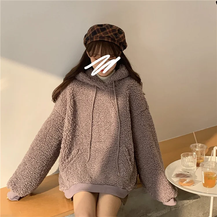 Женские толстовки с капюшоном Kawaii С медвежьими ушками толстовки из овечьей шерсти Осень-зима свободные пуловеры с длинным рукавом однотонные пальто