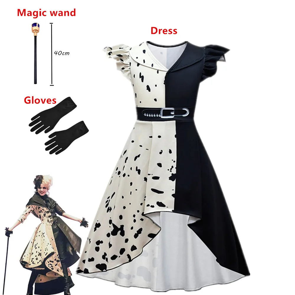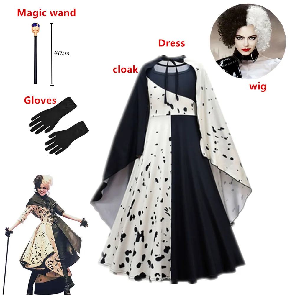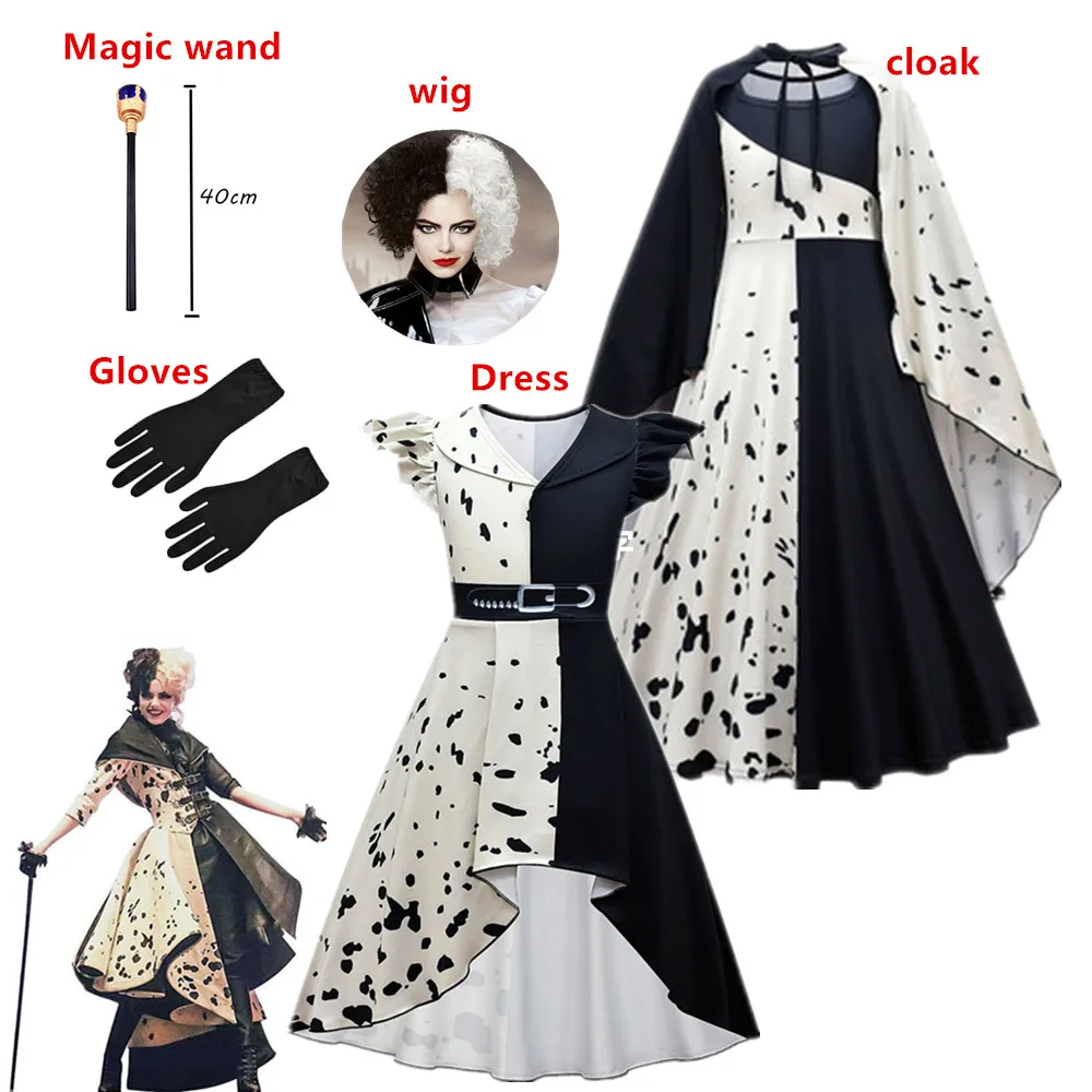 Новый фильм злых мадам Круэлла De Vil, Детский костюм, черный, белый цвет, искусственный парик для вечеринки