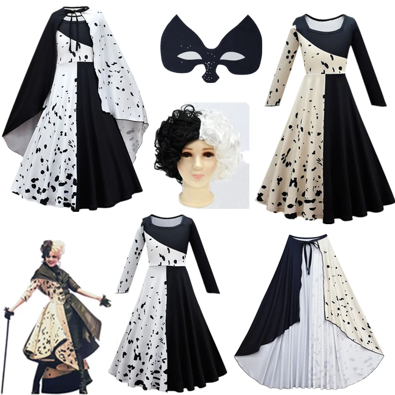 Новинка 2021, костюм для косплея злых мадам кроелла де Виль из фильма, детское платье, черное, белое, искусственное платье для вечеринки с накидкой, парик