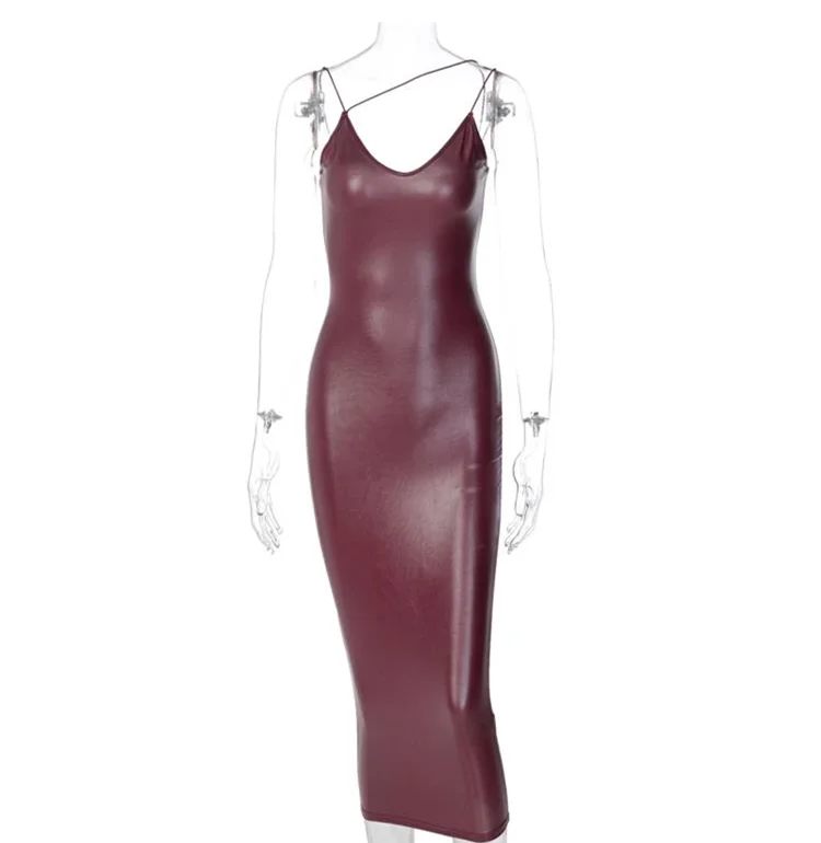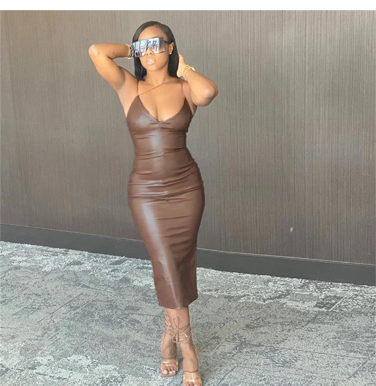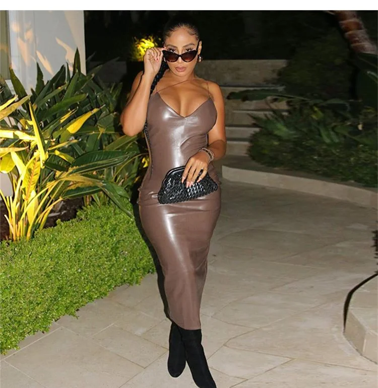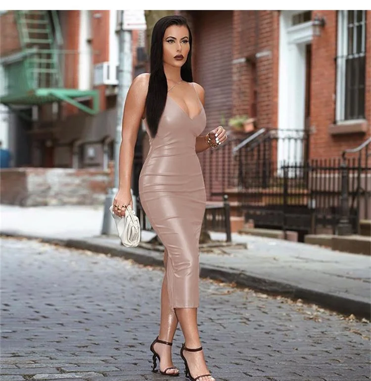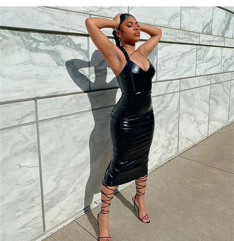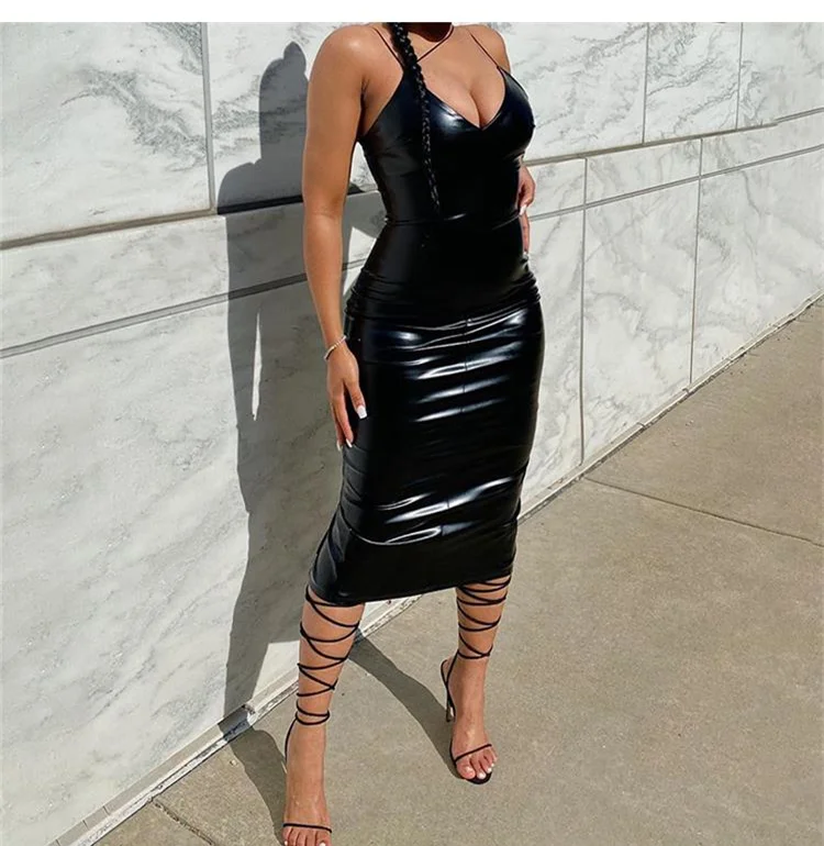 Pu искусственная кожа женские миди платье на бретелях с v-образным ...