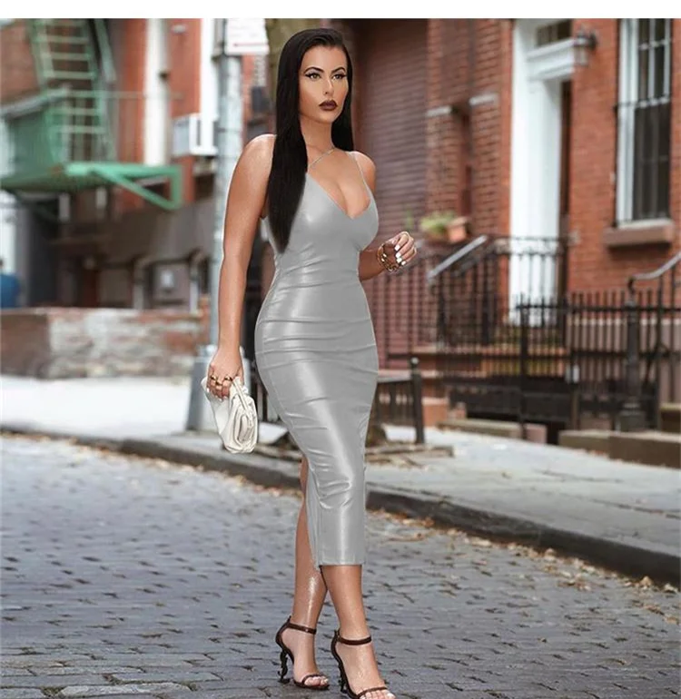 Женское платье из искусственной кожи, с открытой спиной и разрезом, обтягивающие платья с V-образным вырезом, осенние элегантные женские платья без рукавов