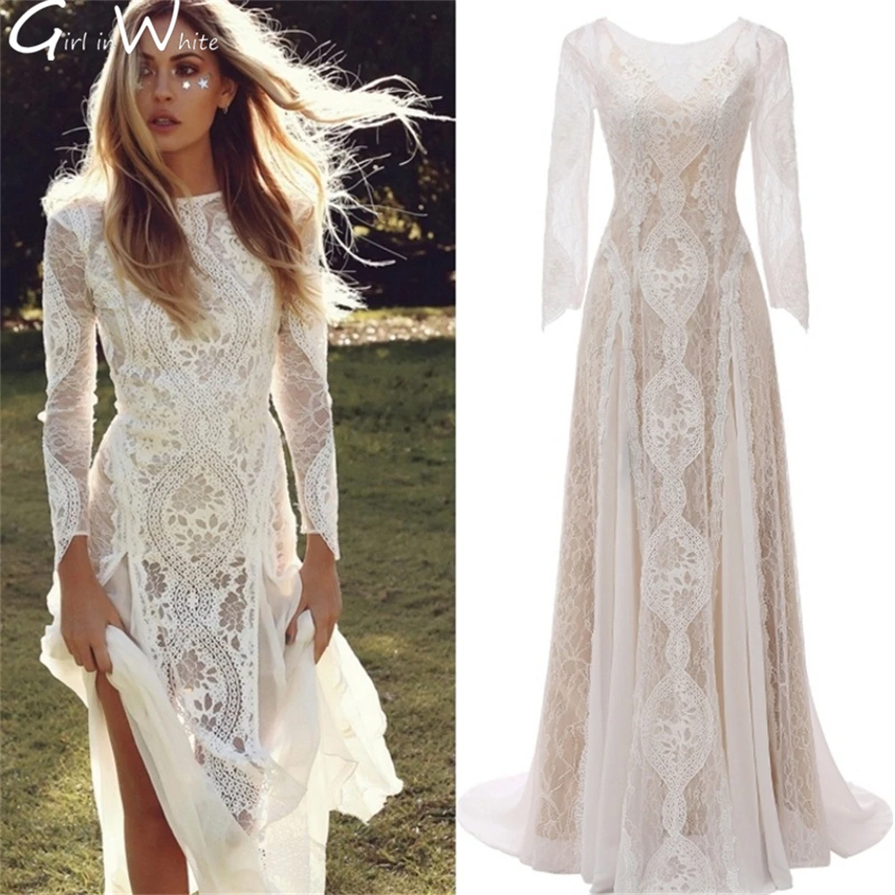 Богемное искусственное сексуальное кружевное свадебное платье с разрезом в стиле бохо, свадебные халаты с длинным рукавом и открытой спиной, Пляжное Платье