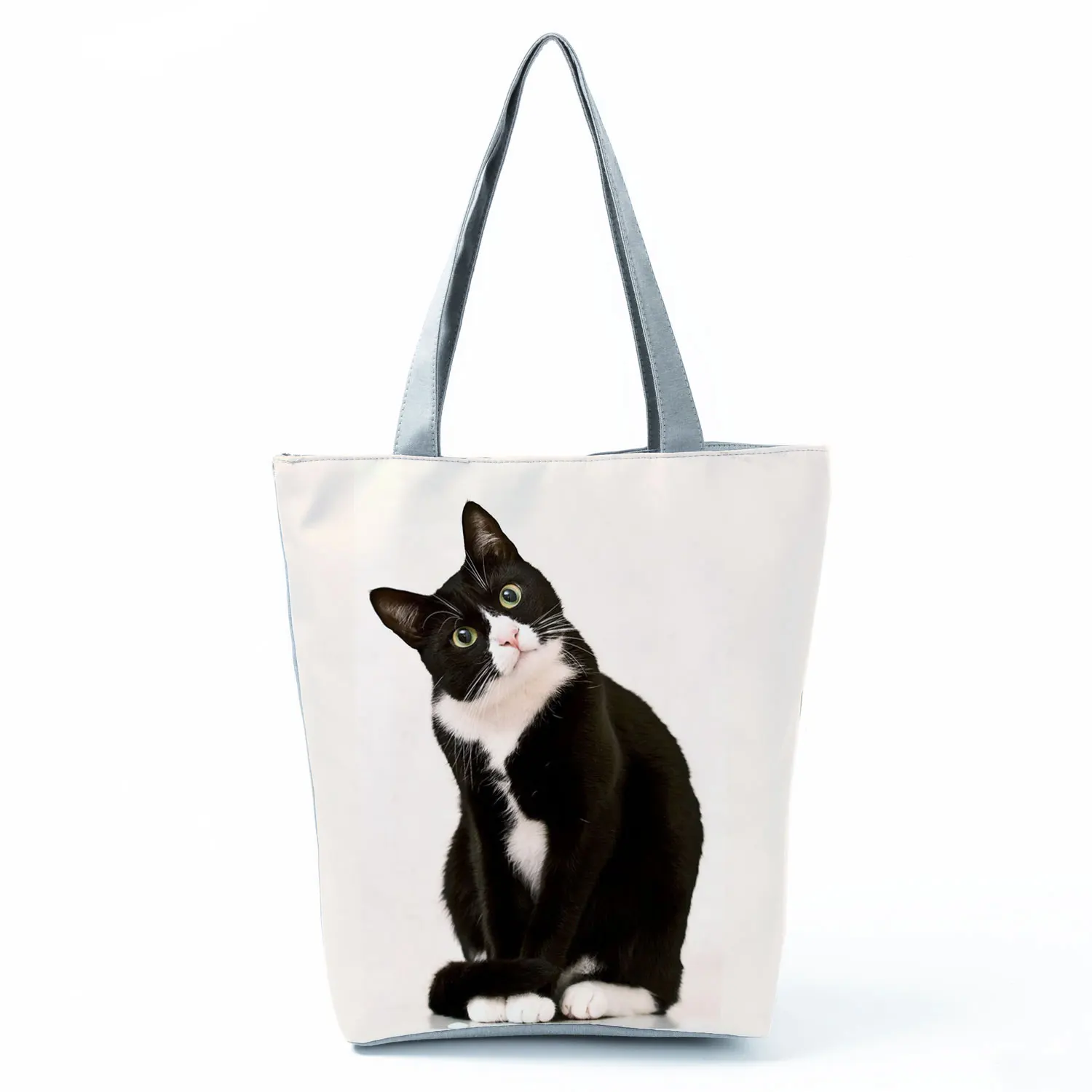 Женская Экологически чистая сумка с принтом кота и черными чернилами, многоразовый офисный мешочек для работы с фруктами, повседневные Простые Модные тоуты на плечо