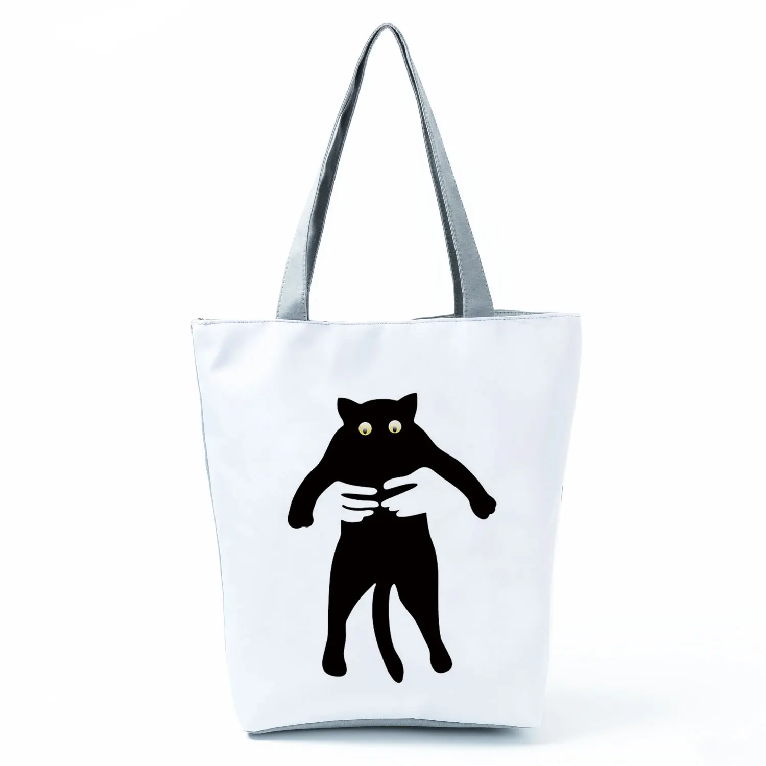 Черная чернильная женская сумка с принтом кота, экологичный фруктовый шоппер для офиса, многоразовый рабочий мешочек, повседневные сумки на плечо, простые модные сумки-тоут
