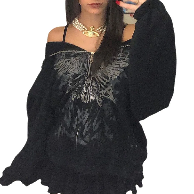 Y2K гранж-панк толстовки большого размера с принтом бабочки черепа ...