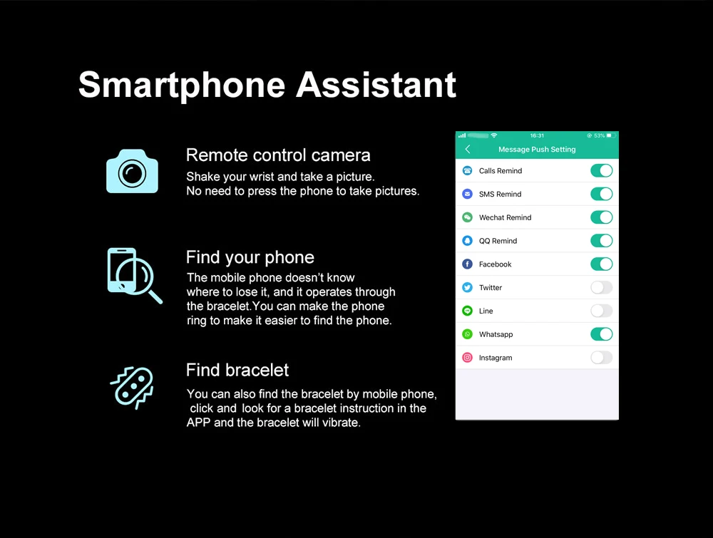 Прозрачный дисплейМонитор сердечного ритмаОтображение параметров здоровьяНапоминание о малоподвижности и питьеНапоминание о звонке/напоминание о сообщении/напоминание о тревогеПотребление калорийМонитор снаУдаленная камераФункция поиска браслетаФункция WeChat и т. Д.