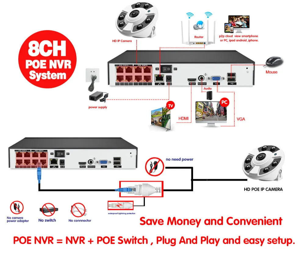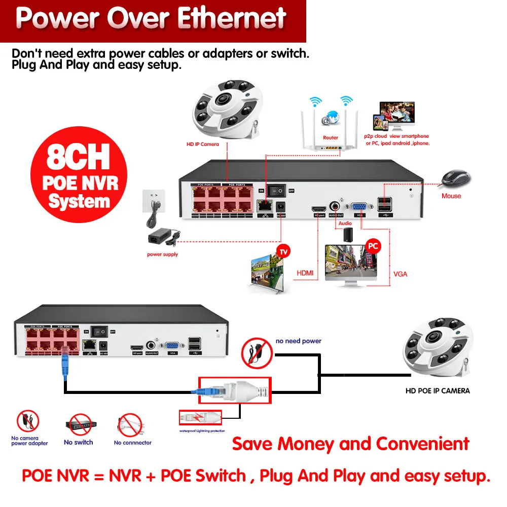 Нет дополнительных кабелей питания или адаптеров, просто подключив ip-камеру к NVR с помощью одного кабеля, вы можете легко завершить установку без знания о компьютере или сети и начать наслаждаться супер простым мониторингом среди вашего смартфона, планшета или ПК.