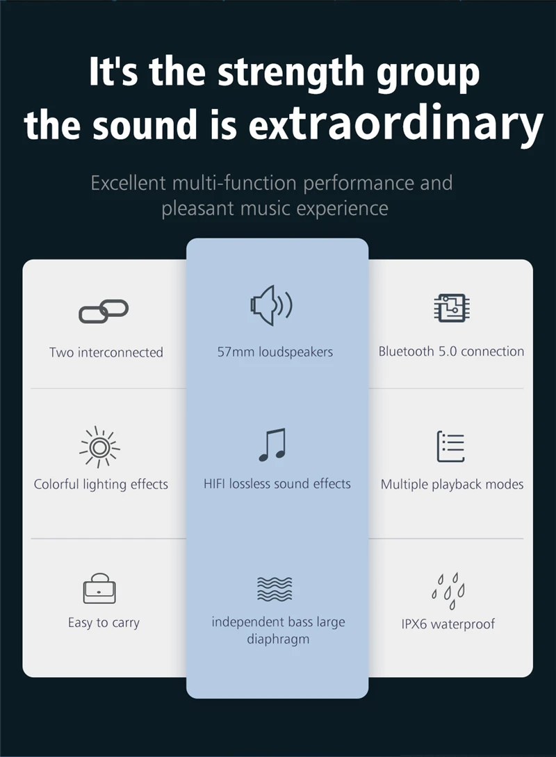 Емкость аккумулятора: 4400 мА Версия Bluetooth: 5,0 динамик: 20 Вт дальность передачи: 10 м Частотная характеристика: 100Hz-20KHzSignal к Коэффициент шума: ≥ 85 дБ Рабочее напряжение: 3,7 в Искажение: <1% Напряжение зарядки: 5 в пост. Тока порт зарядки: время разговора Micro usb: 10 hвремя воспроизведения: 12 hвремя ожидания: ≥ 90 дней Время зарядки: 6-10hразмер упаковки: 100*100*140 мм Вес: 560 г