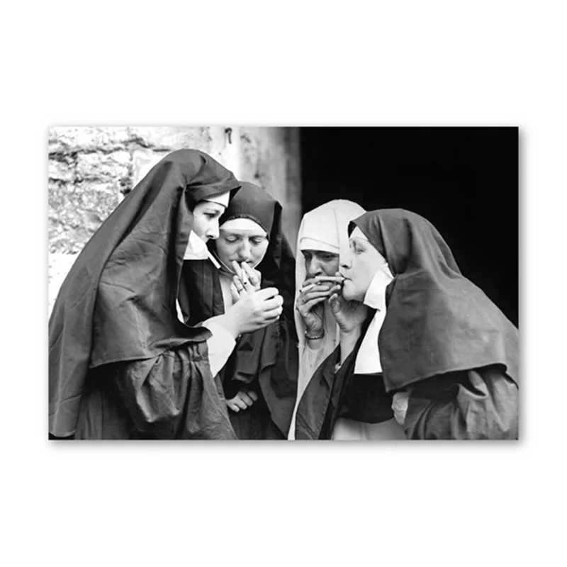 Винтажный плакат с изображением курящей монахини, черно-белый плака...