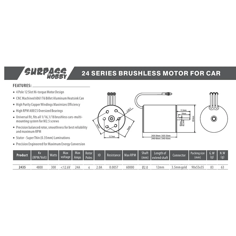 1. 4 полюс 12 Слот hi-крутящий мотор дизайн.2. Высокое качество: CNC обработанный алюминиевые заготовки 6061 T6 радиатор, высокая чистота медных обмоток максимизирует эффективность, высокая RPM ABEC5 негабаритные подшипники.3. Универсальный, подходит для всех 1:16,1:18 2S RC автомобилей.4. Прецизионный сбалансированный ротор, гладкость для лучшей надежности и максимальных оборотов в минуту.5. Статор-супертонкие (0,35 мм) пластин.Характеристики:Бренд: SURPASSHOBBYСерия: KKНазвание: 2435 RC моторКВ (об/мин/Вольт): 4800квВатт: 300Макс. Об/мин: 60000Максимальное напряжение: менее чем 13,2 VМакс Ампер: 22AВал: 2,0 ммДлина вала: 12 ммЦвет: черный + красныйМатериал: пластик + металлРазмер: около 2,4х3, 5 смПосылка:1 x безщеточный мотор для безщеточного двигателя SURPASS HOBBY KK 24351 х РуководствоТолько вышеуказанная посылка, другие товары не включены.Примечание: светильник и различные дисплеи могут привести к тому, что цвет товара на картинке немного отличается от реального. Допускается погрешность в измерениях +/- 1-3 см.