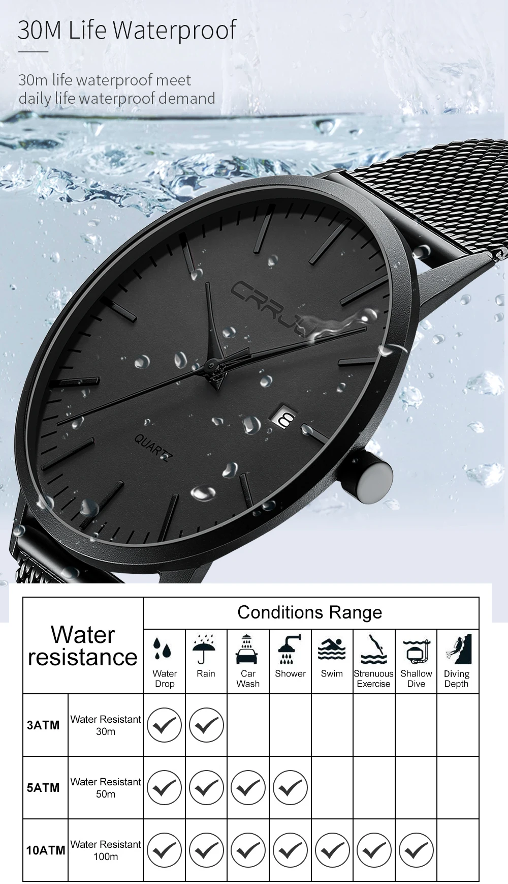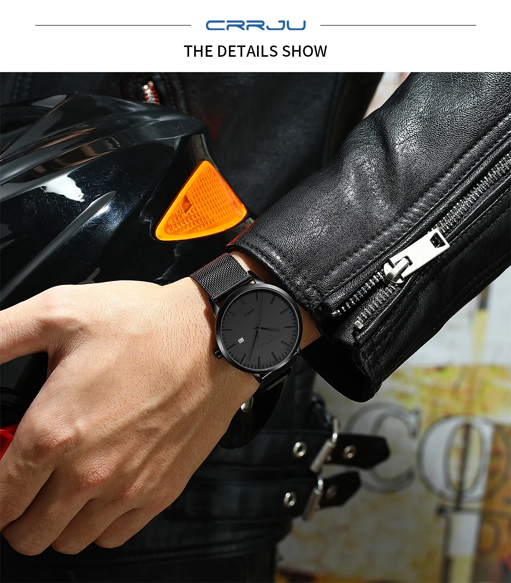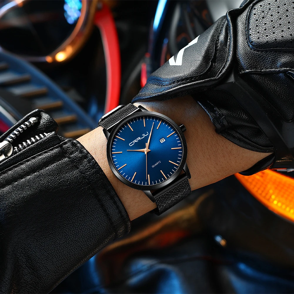 CRRJU модные мужские часы, ультратонкие кварцевые часы, мужские повседневные тонкие сетчатые стальные водонепроницаемые спортивные часы, черные мужские часы