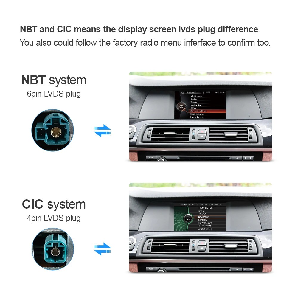 > Примечание: CIC и NBT только что имеют экран lvds разница в вилке, остальное то же самое.> Следуйте за автомобилем год или оригинальный завод Главный блок экрана меню, чтобы выбрать правильный.> CIC означает, что разъем LVDS на дисплее 4pin> NBT означает, что разъем LVDS дисплея составляет 6pin> Для BMW 5 серии F10/F11 520i 525i 528i(2011-2012) CIC> Для BMW 5 серии F10/F11 520i 525i 528i (2013-2017) NBT