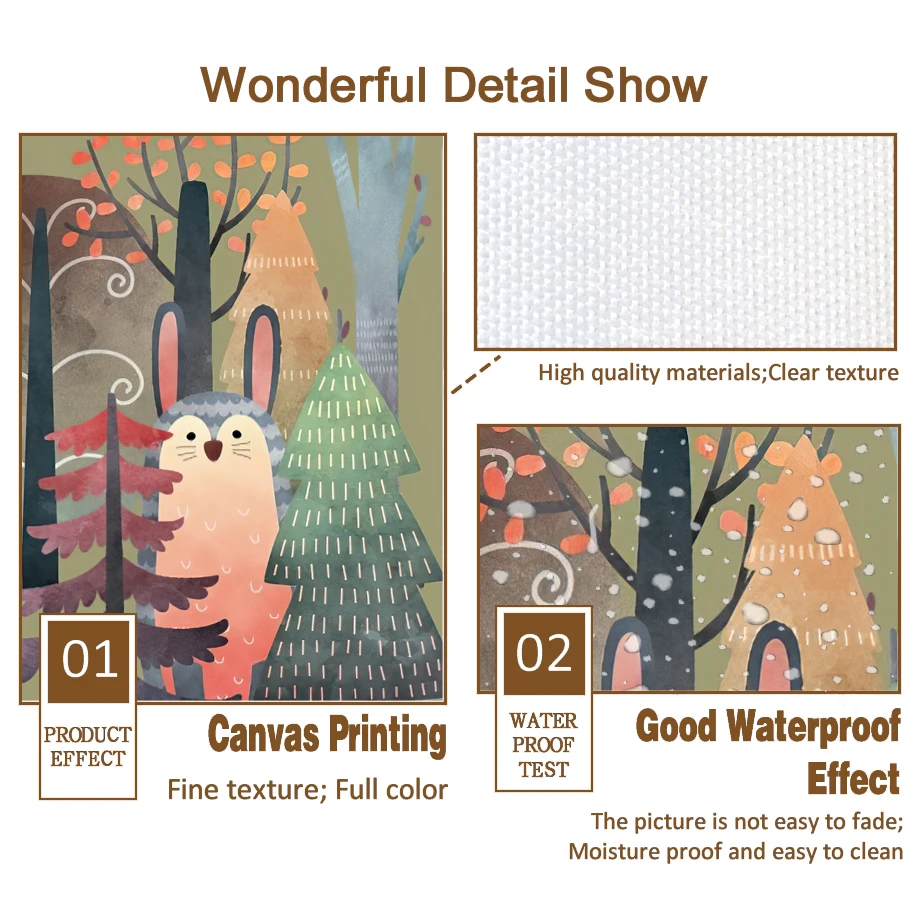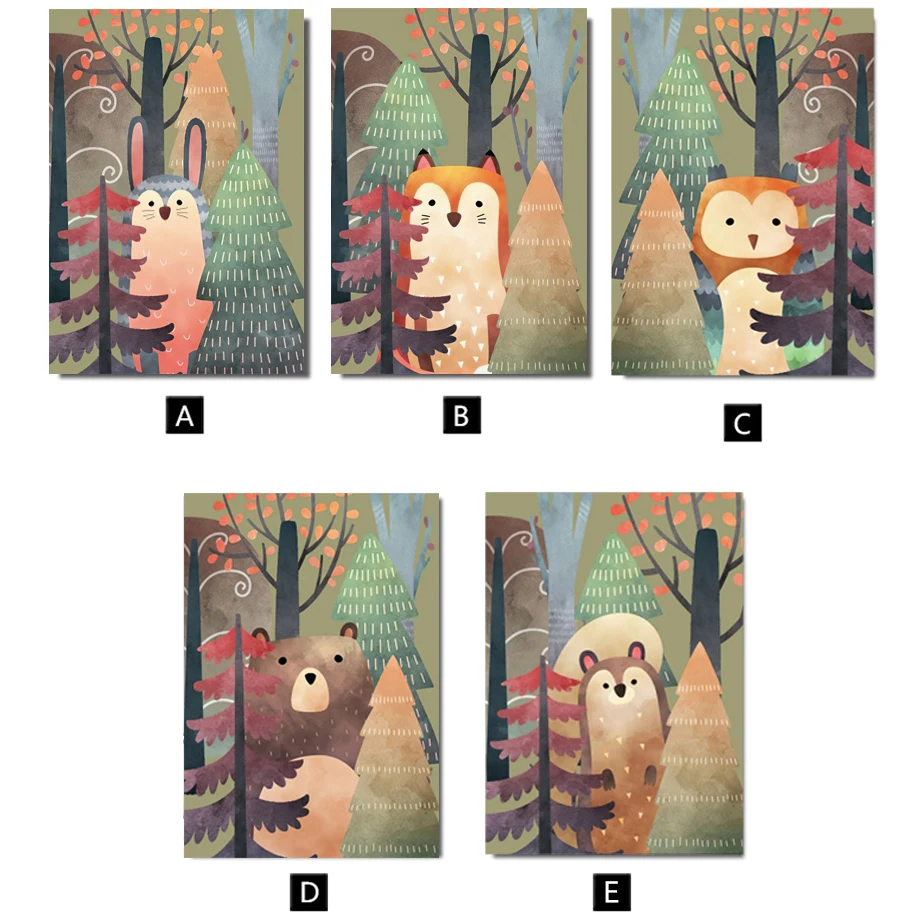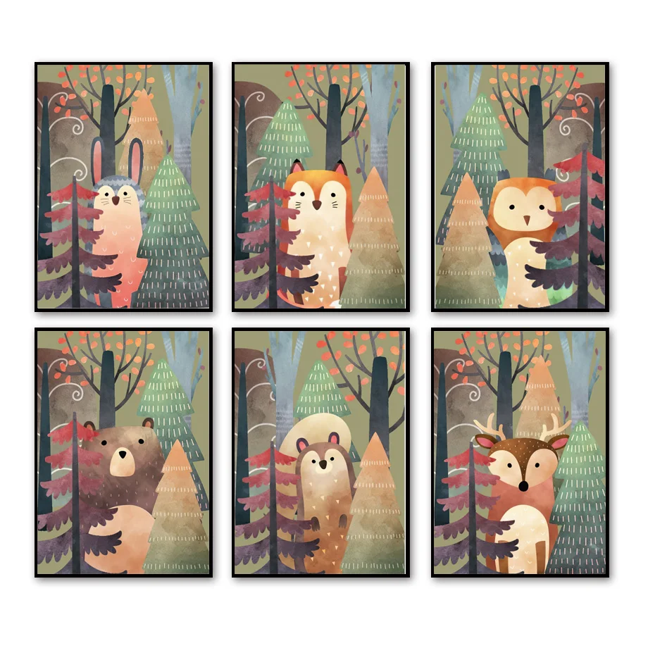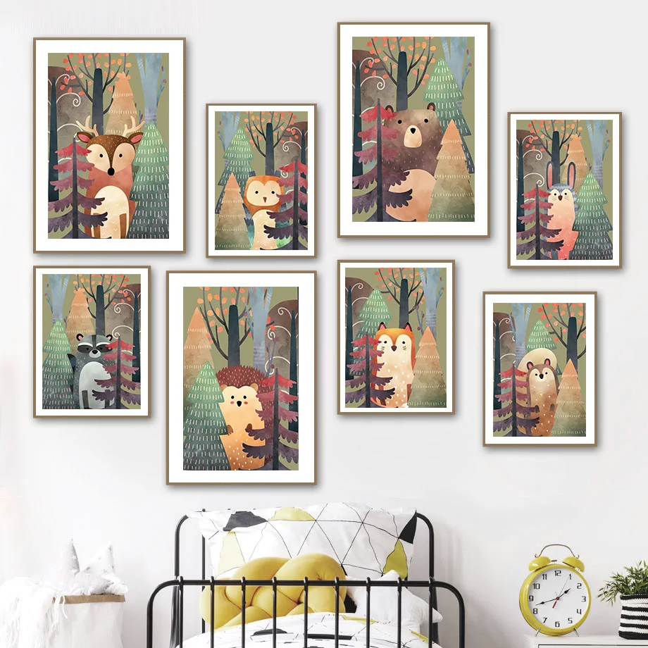 Мультяшный лес Кролик енот Олень Медведь Сова акварель Скандинавска...
