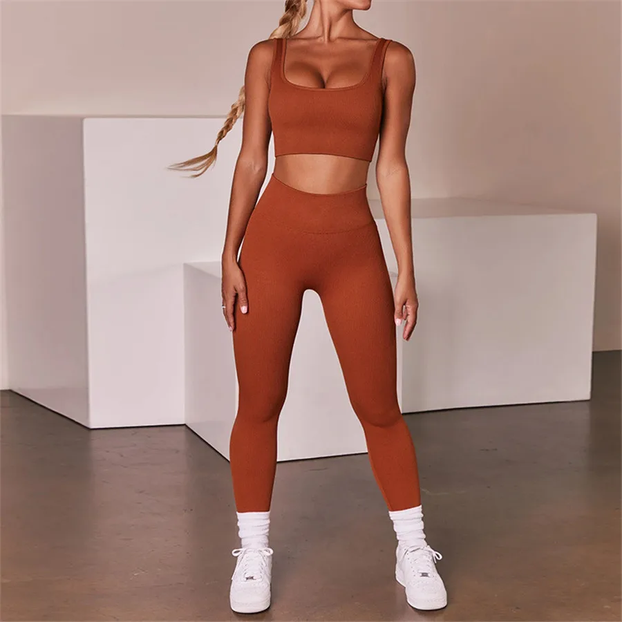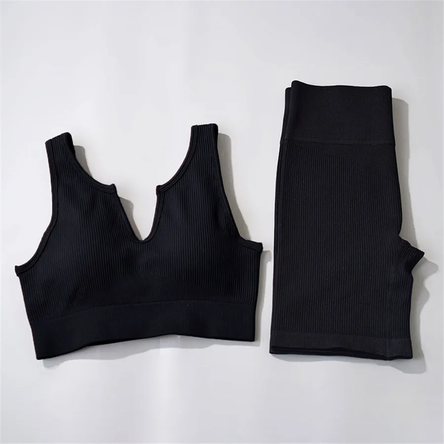 Экипировка в рубчик, Женский бесшовный комплект, для тренажерного зала, тренировок, велосипедные шорты, для фитнеса, йоги, с глубоким вырезом, спортивный бюстгальтер, Байкерский с мягкими вставками