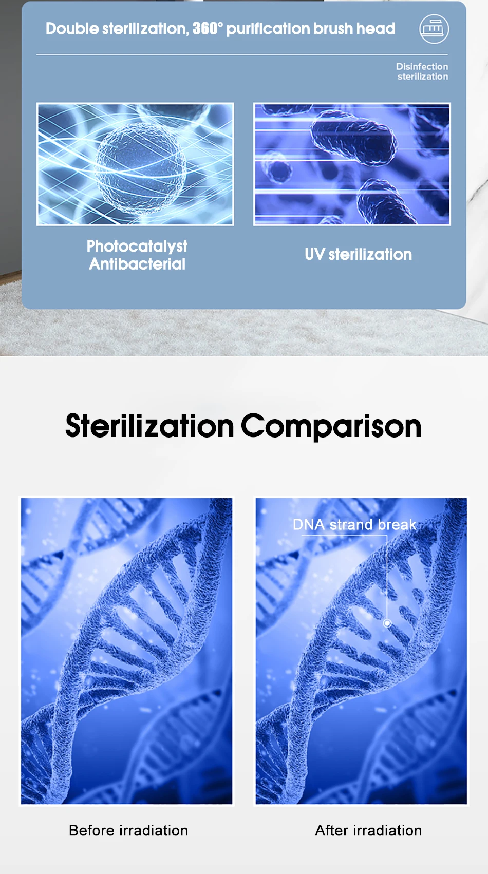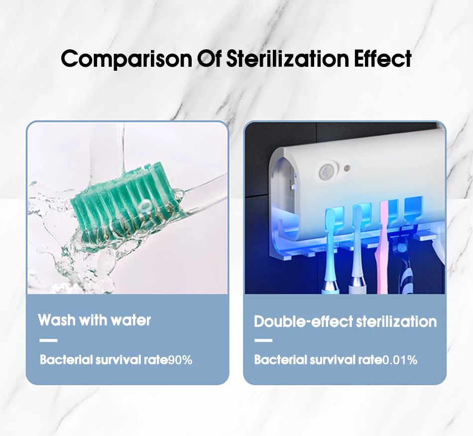 2.USB перезаряжаемая и встроенная солнечная панель-со встроенной литиевой батареей емкостью 1800 мА · ч и солнечной панелью, наше устройство для УФ-дезинфекции зубных щеток обеспечивает двойную зарядную модель. Это может быть зарядка через USB и зарядка от солнечной панели.