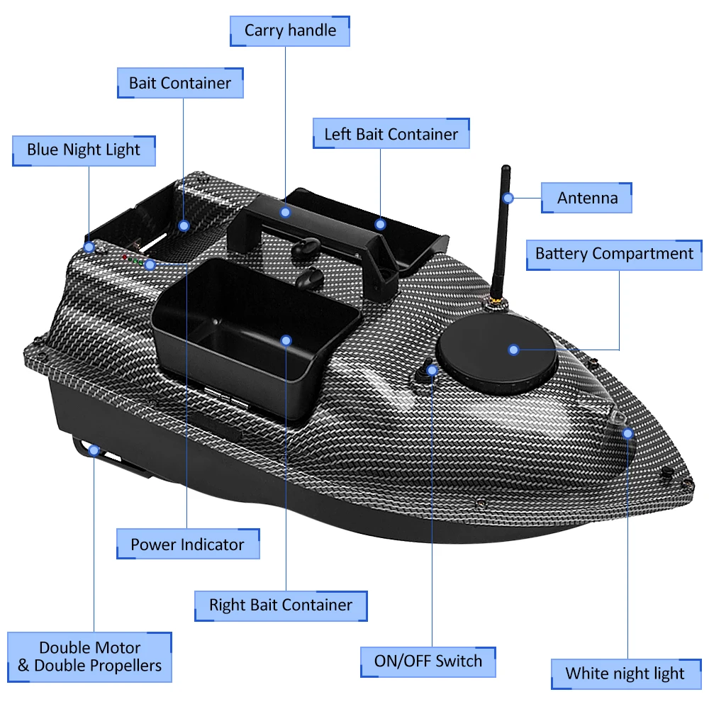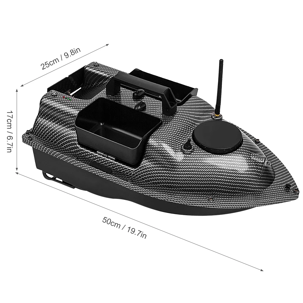 Особенности:Функция GPS помогает установить 4 произвольных точки позиционирования, и лодка может быть вперед и назад на основе точки, которую вы устанавливаете.При обнаружении потери сигнала или низкого заряда батареи лодка автоматически вернется в исходное положение через 15 секунд. Не беспокойтесь о потере.ЖК-дисплей пульта будет отображать несколько данных для вашего, таких как питание батареи, расстояние, компас, положение и светильник.3 контейнера для наживки с около 4.4lb несущей способностью для большего количества наживок.Беспроводное управление и Круизный переключатель с фиксированной скоростью позволяют выпустить приманку далеко. (Дистанционный диапазон: 500 метров/540 ярдов)Двойные двигатели и двойные пропеллеры делают лодку легкой в спорте и кролировании.1 передние белые огни и 2 задние синие ночные огни для ночной рыбалки и кормления.Лодка-приманка питается от аккумуляторной батареи (в комплекте). Съемный аккумулятор позволяет легко заряжать отдельно без лодки.Обтекаемый корпус уменьшает Водонепроницаемость и 6-7 уровней устойчивость к волнам.Пульт дистанционного управления питается от 4 батареек AA (в комплекте).Спецификация:Функция: без GPS/с GPS (опционально)Аккумулятор лодки-приманки: 5200 мАч/12000 мАч (опционально)Время работы: прибл. 3 ч/5 чВремя заказа: ≥ 10 часов/≥ 14 часовМатериал: АБС-пластикНесущая способность: кг/2 кг/4,4 фунтов лёгкий нейлоновый тросДистанционный диапазон: 500 м/540 ярдовПульт дистанционного управления: 4 батарейки типа АА (в комплекте)Размер лодки: 50*25*17 см/19,7*9,8*6,7 дюймовВес: прибл. 1,7 кг/3,7 фунтовРазмер посылка: 56*32*25 см/22,0*12,6*9,8 дюймовВес посылка: прибл. 2,58-2,82 кг/5,7-6,2 фунтов лёгкий нейлоновый тросПосылка:1 * Лодка-приманка1 * батарея лодки приманки1 * пульт дистанционного управления4 * батарейки AA (для дистанционного управления)1 * антенна1 * Руководство пользователя1 * зарядное устройство2 * Запасные пропеллерыПримечание:1. Цвет товара, отображаемый на фотографиях, может немного отличаться на мониторе вашего компьютера, так как мониторы. Спасибо за понимание.2. Контейнер для наживки влево и вправо без функции самостоятельного возврата, вы должны вытянуть его назад руками после освобождения. Но задний контейнер для наживки возвращается обратно с помощью пульта дистанционного управления.3. Больше работы с пультом дистанционного управления, пожалуйста, обратитесь к руководству пользователя.