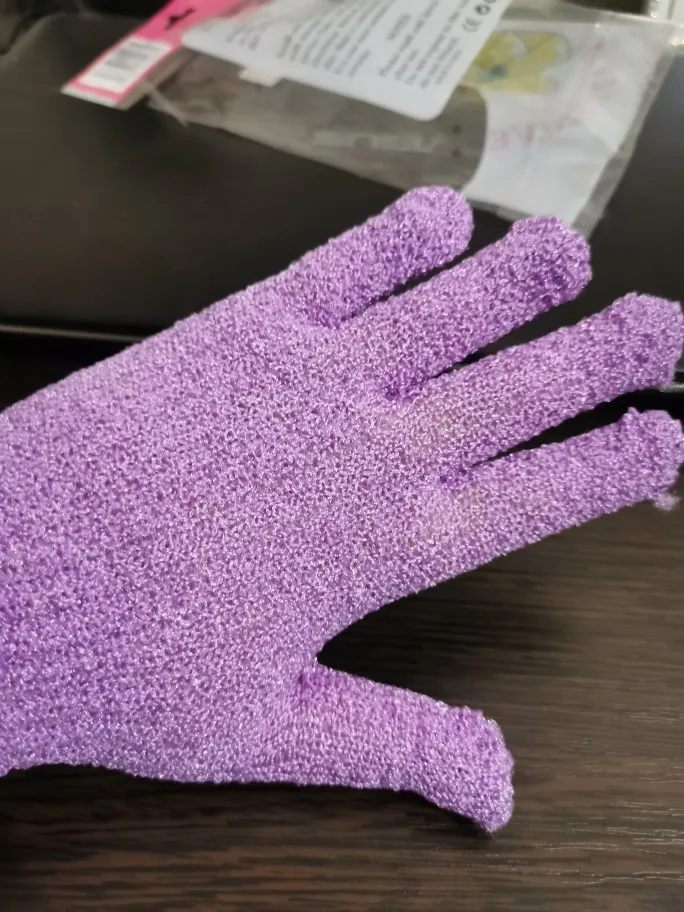 Очень классная перчатка. Хорошо скрабирует. Умерено жёсткая, не царапает. Рекомендую