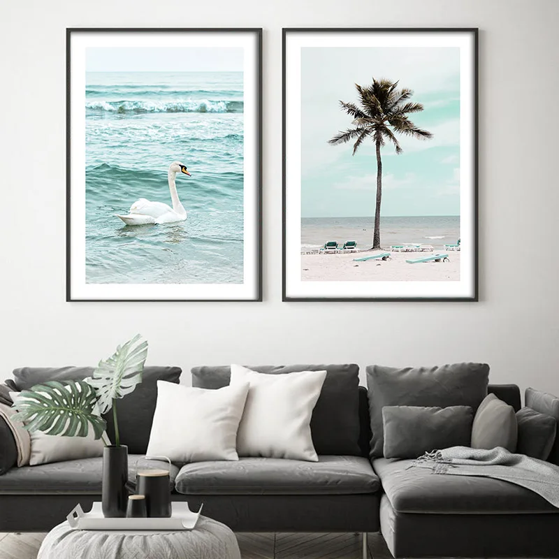Холщовый постер Sunny Beach Ocean, ракушка, пальма, морской пейзаж, фотография, живопись, синяя зеленая стена, Художественная печать, картина, декор для гостиной