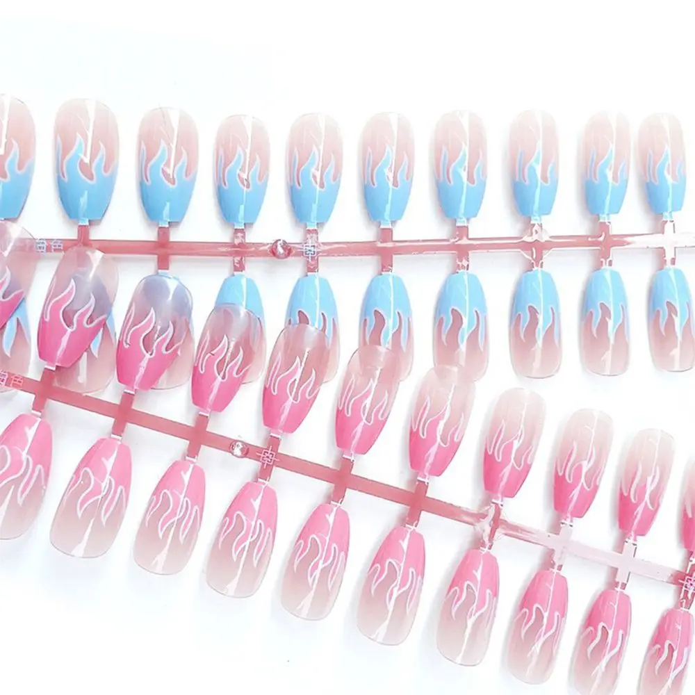 24 шт., накладные ногти синего и розового цвета с рисунком пламени