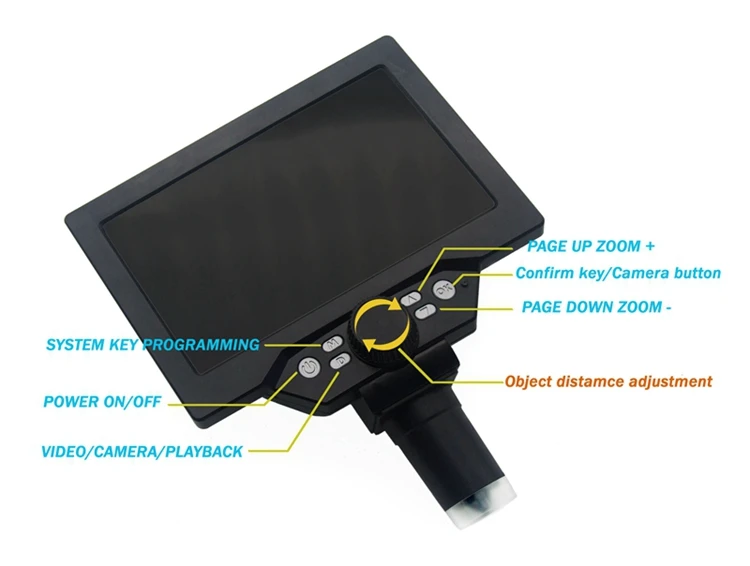 МощностьНажмите 2 секунды для включения/выключенияM ключ: Настройка функцииЭкономия экрана: выключено • 30 сек • 1 мин • 2 мин (опционально)Автоматическое выключение: выключено. 3 минуты. 5 минут. 10 минутHz светильник источник света: 50 Гц • Ток на 60 ГцВарианты языка: 16 языковНастройка даты: год, месяц, день | Час, минута, секундаФормат: да/нетПо умолчанию: да/нетV.1. 0 Версия №: версия: H69G-V1.0-20190824Рабочее расстояние:Ближайшее расстояние между объективом машины и объективом составляет около 10 мм, когда максимальное увеличение. Напротив, чем дальше объектив от объекта, тем меньше увеличение.