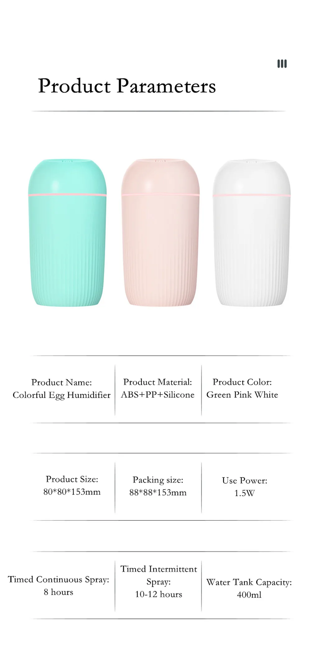 Емкость резервуара для воды: 400 млЦвет изделия: зеленый/белый/розовыйМатериал изделия: абс + ПП + силиконРазмер изделия: 80*80*148 ммПрименение Мощность: 1,5 WНепрерывное распыление: работает около 8 часовПрерывистый спрей: работает около 10-12 часовЕсть 3 вида товара, пожалуйста, внимательно разместите заказ, спасибо.Посылка 1:Увлажнитель воздуха * 1USB разъем * 1Руководство * 1