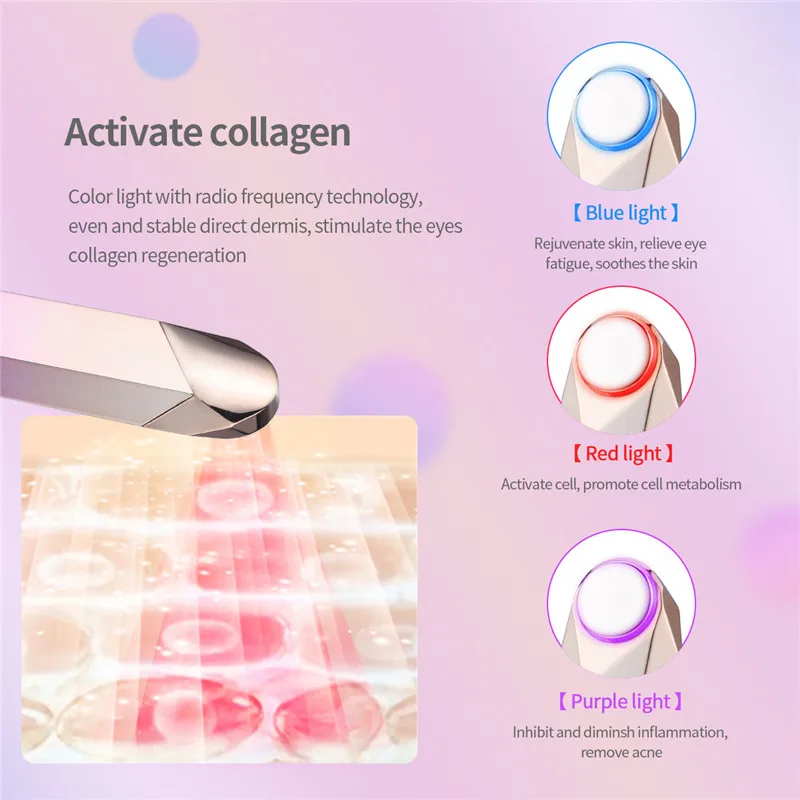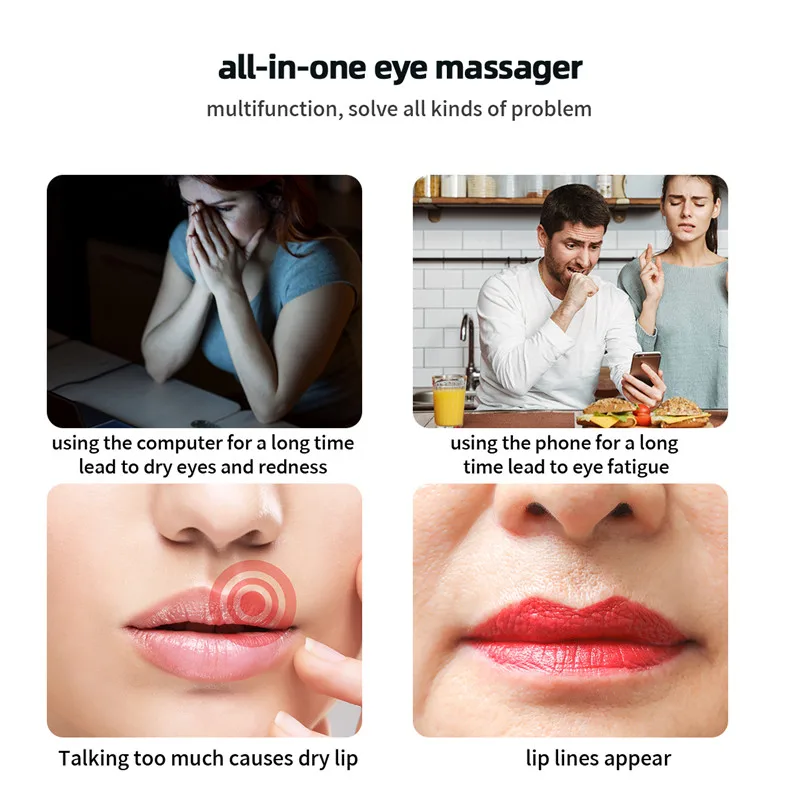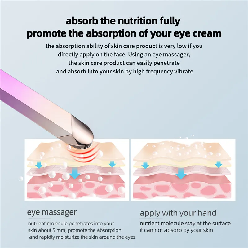 1. Высокочастотная вибрация может эффективно снять усталость глаз, повысить кровообращение глаз, удалить темные круги, мешки для глаз, тонкие линии, частицы жира и т. Д.Горячий компресс с постоянной температурой 2,42 ℃ увеличивает микроциркуляцию ваших глаз, снимает сухость глаз, усталость и давление.3. Он также может использовать на губе, мягко массировать, может выцветать линии губ и увлажнить губы.Ультразвуковая микрораспылительная технология 4,3 МГц способствует поглощению питательных веществ.5,3 цветовых огней: красный свет, синий свет, фиолетовый свет. Он автоматически отключится, если не будет операции в течение 5 минут.3 вида цветов свет:-Красный свет: активирует клетки, способствует метаболизму клеток-Синий свет: омолаживает кожу, снимает усталость глаз, успокаивает кожу-Фиолетовый свет: подавляет и уменьшает раздражение
