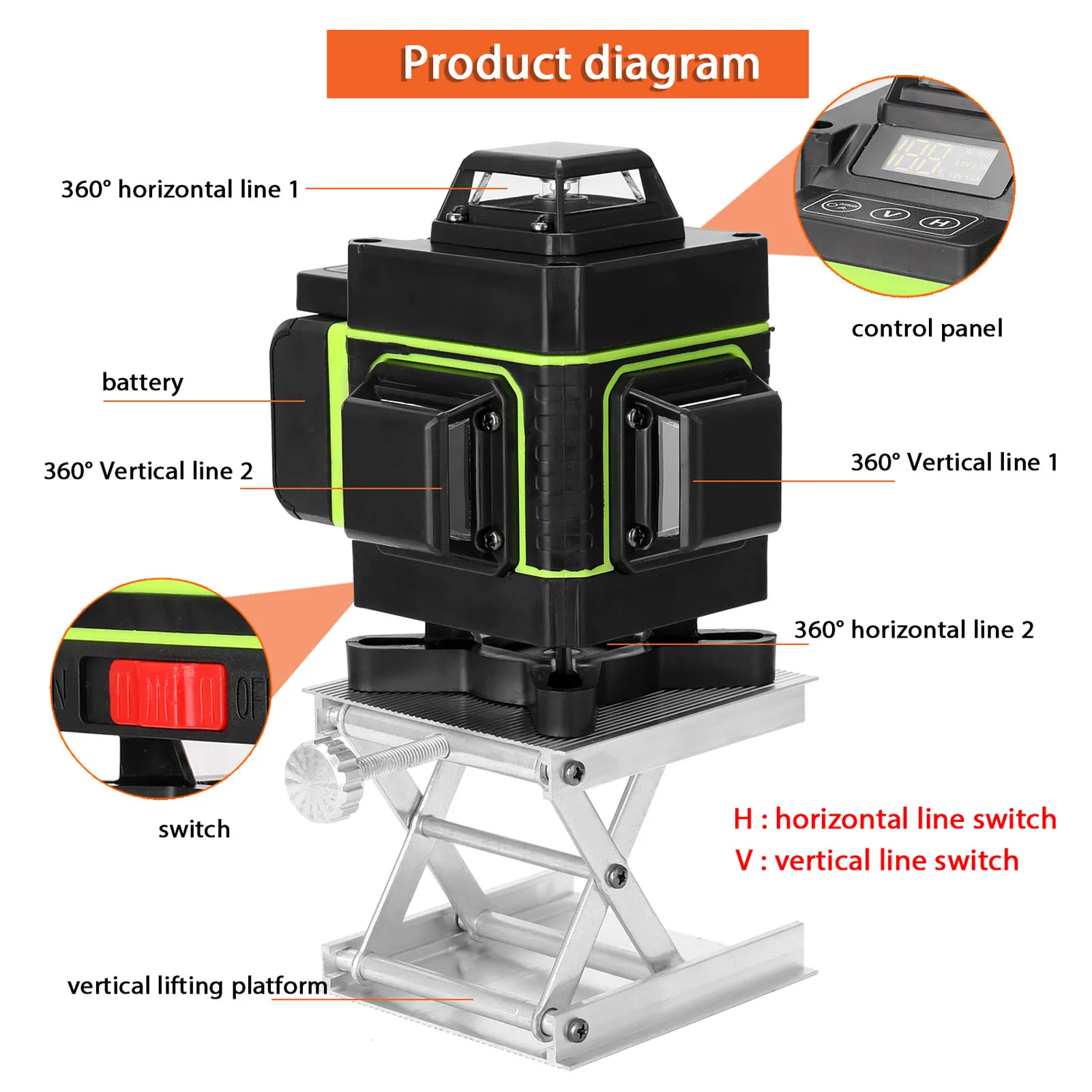 Самонивелирующийся лазерный уровень, 16 линий, 4D, 360 градусов