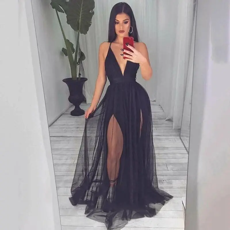 Женское вечернее платье с открытой спиной, черное платье из органзы с V-образным вырезом, простая модель 2021