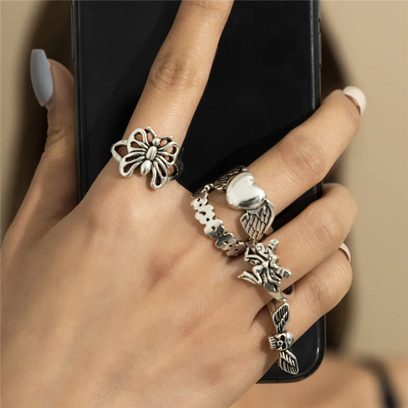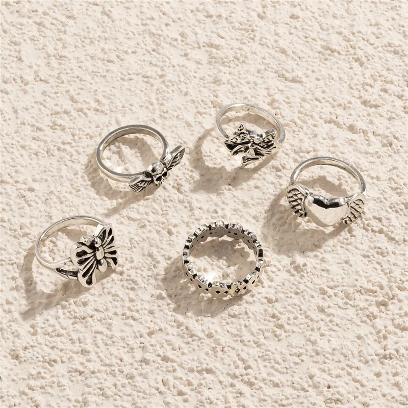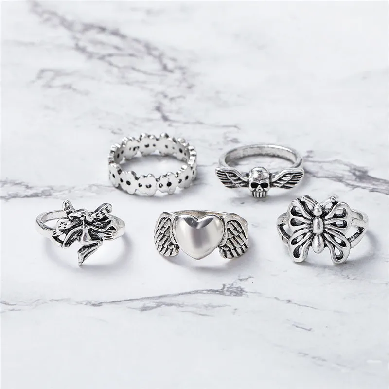 Кольцо в стиле панк для женщин и девушек, мода 5 шт.компл., серебряные кольца в стиле бохо с бабочкой и сердцем, Подарочные Кольца, 2021, Женские Ювелирные Украшения для вечеринки
