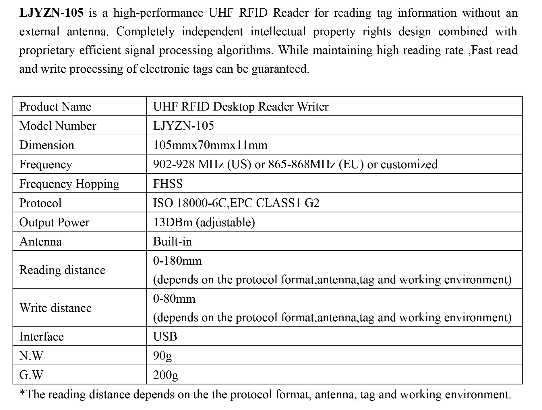 ProtocolISO 18000-6C,EPC CLASS1 G2