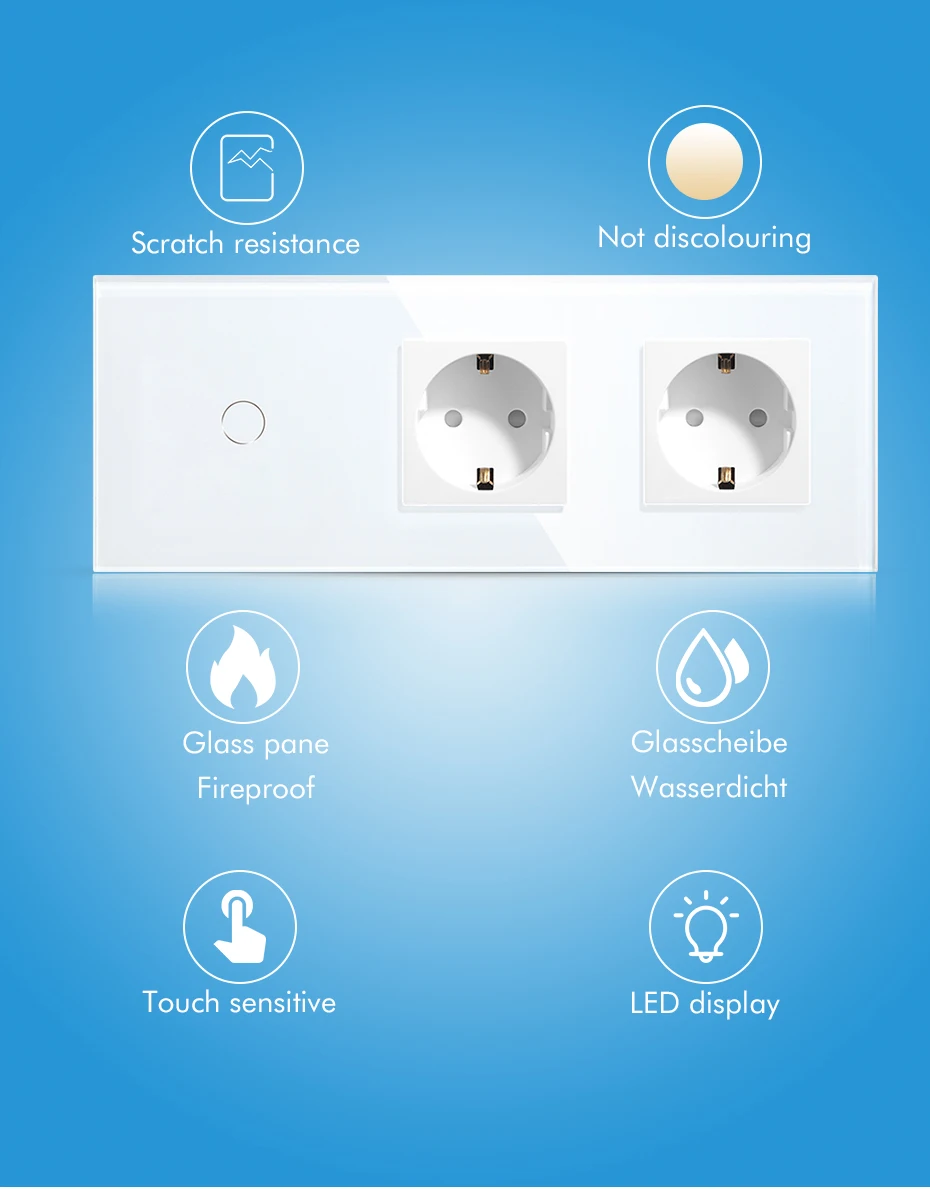 Технические параметрыРазмер изделия: 86*229*35 ммМатериал корпуса: огнестойкий материал из поликарбонатаМатериал панели: закаленное стеклоНоминальное рабочее напряжение: 110 В ~ 240 В переменного токаМощность: -15% ~ + 10%Мощность нагрузки: 3-800 Вт/комплект, 2000 ВтРабочая температура: -20 ℃ ~ + 70℃Относительная влажность: 10% ~ 93% (без конденсации)Рабочая частота: 50/60 ГцПотребление энергии: 0,02 ВтДолговечность: 100000 раз работы/