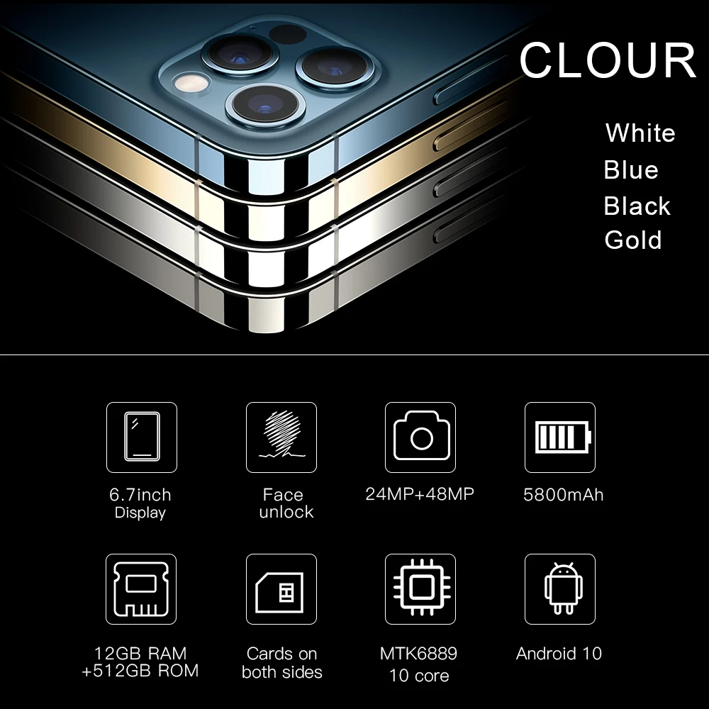 Смартфон 6,7 дюйма, сотовые телефоны Android 10,0, разблокировка по отпечатку пальца, распознавание лица, двойная камера, 4G, смартфон, мобильный телефон