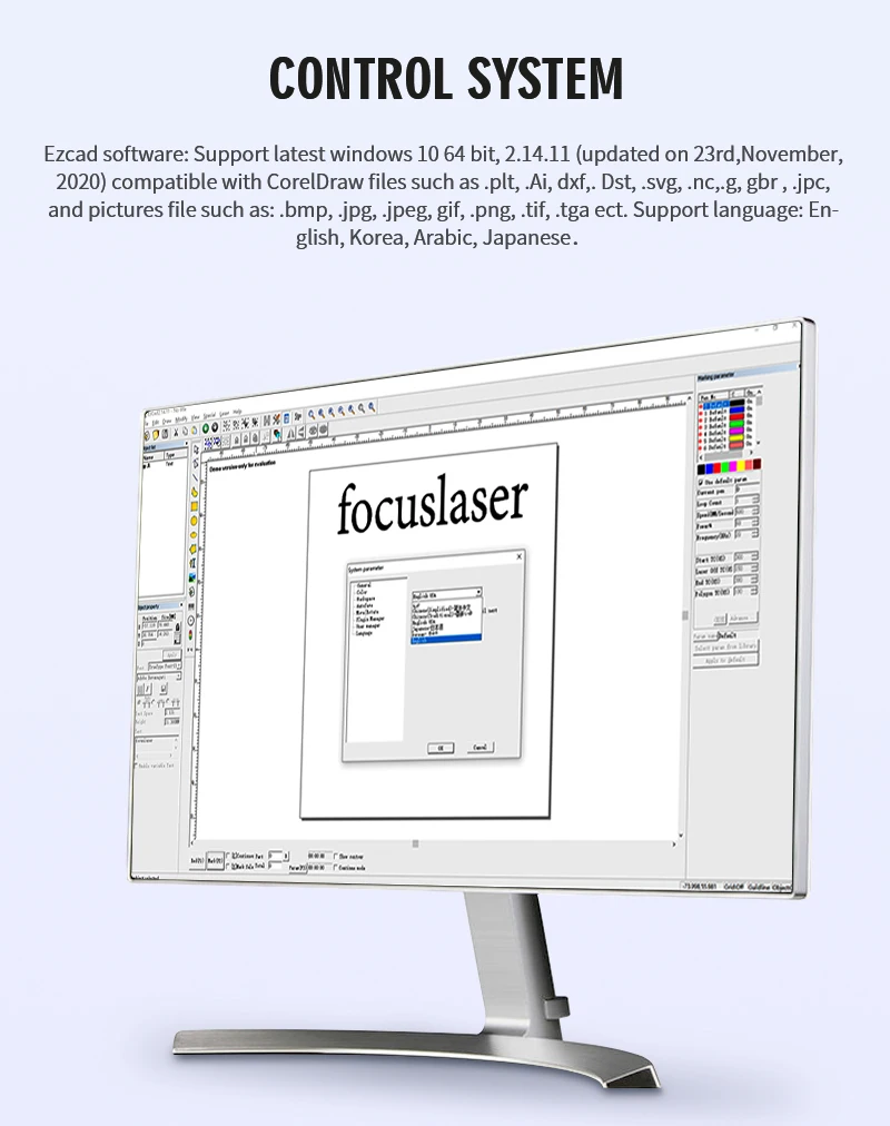 Программное обеспечение Ezcad: Поддержка последних 64 бит windows 10, 2.14.11 (Обновлено 23 ноября 2020 года) Совместимость с CorelDraw файлами, такими как. Plt,. Ai, . Dxf,. Dst,. Svg,. Nc,.g, gbr, . Jpc и изображения, такие как:. Bmp,. Jpg,. Jpeg,. Gif,. Png,. Tif,. Tga ect. Язык поддержки: английский, корейский, арабский, японский