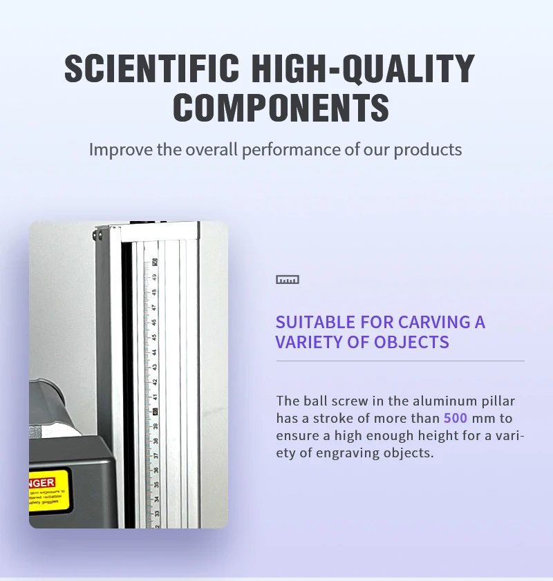 Алюминиевый столб с шариковыми винтами внутри более 500 мм, чтобы обеспечить достаточную высоту использования для многих видов гравировальных объектов.