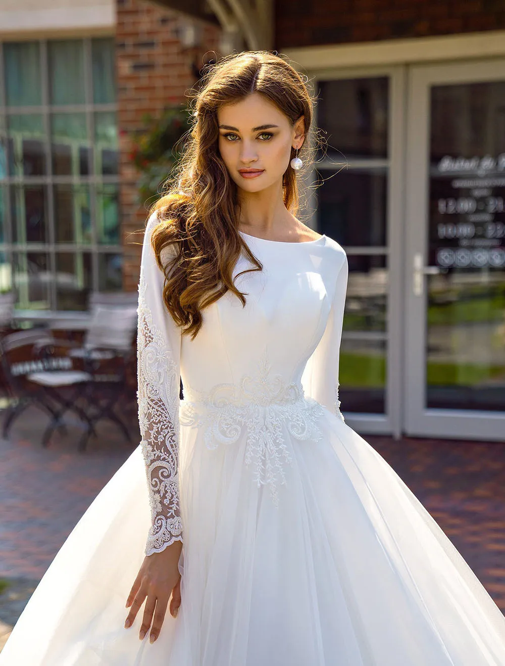 Свадебное платье с длинным рукавом, круглым вырезом и аппликацией и...