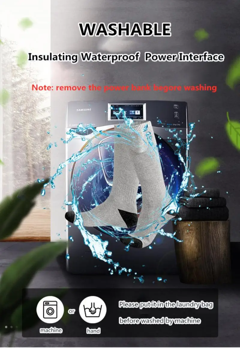 -Нагревательный элемент: нагревательный элемент находится внутри носка. Специально разработанный карман банка питания безопасен и прост в переноске.