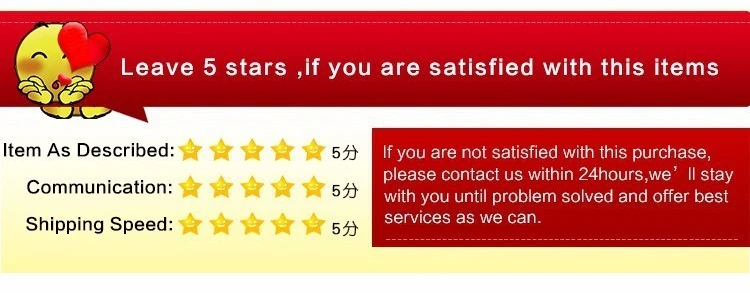 Мы являемся надежным продавцом и имеем профессиональное послепродажное обслуживание для всех наших таможенных служб. Если есть какие-либо вопросы о заказе, пожалуйста, свяжитесь с нами заранее, мы всегда будем здесь, пока вы не получите счастливый ответ.1. Пожалуйста, проверьте посылка и товар, когда вы получите тщательно, чтобы убедиться, что нет проблем.2. Если у вас есть какие-либо проблемы или вы не полностью удовлетворены своей посылка, пожалуйста, не стесняйтесь связаться с нами, прежде чем оставлять негативные отзывы. Мы решим проблему, чтобы удовлетворить вас.3. Если нет проблем, пожалуйста, оставьте нам положительный отзывы 5 звезд.