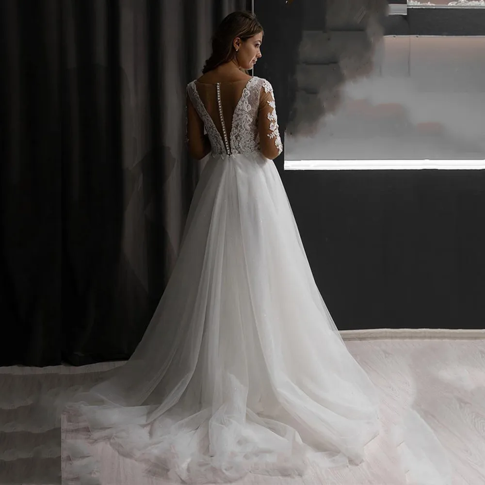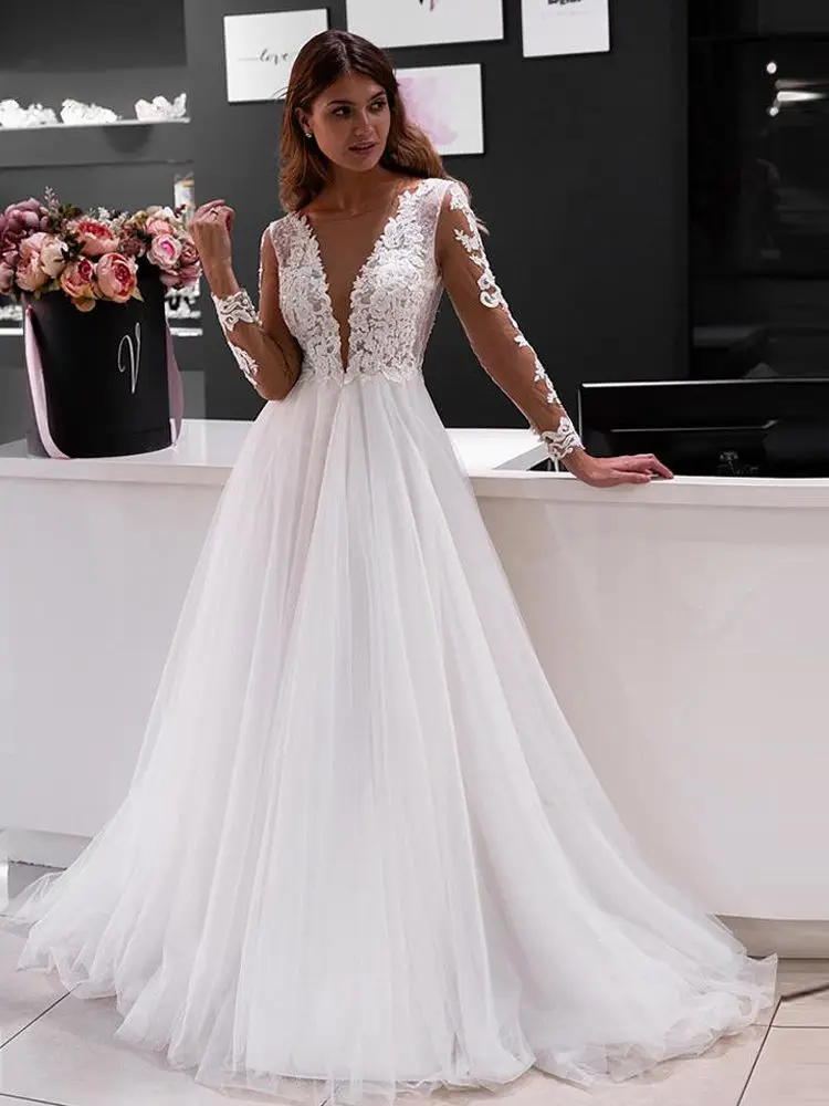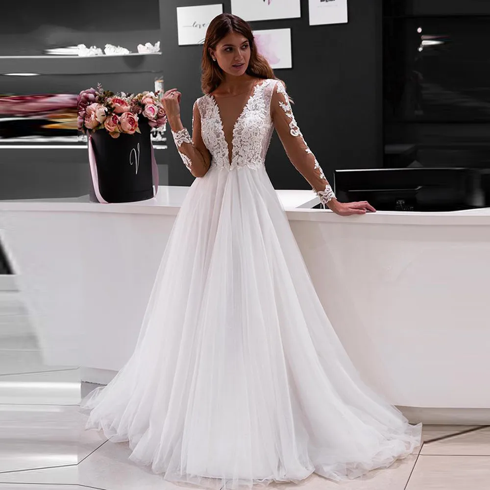 Элегантное кружевное свадебное платье, с длинными рукавами, аппликациями, V-образным вырезом, пляжное платье-трапеция из тюля белого цвета и слоновой кости, простое свадебное платье